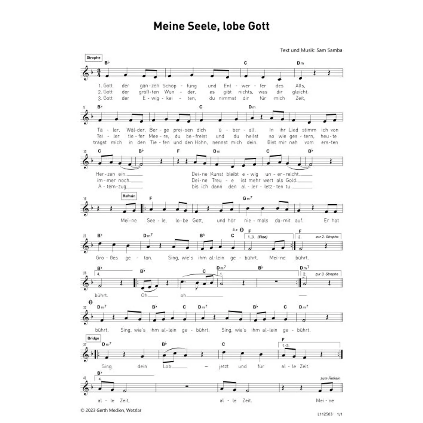 Meine Seele, lobe Gott (diese Variante haben Sie gerade ausgewählt) (einstimmig, mit Akkorden, F-Dur) Sam Samba (Komposition, Text) |