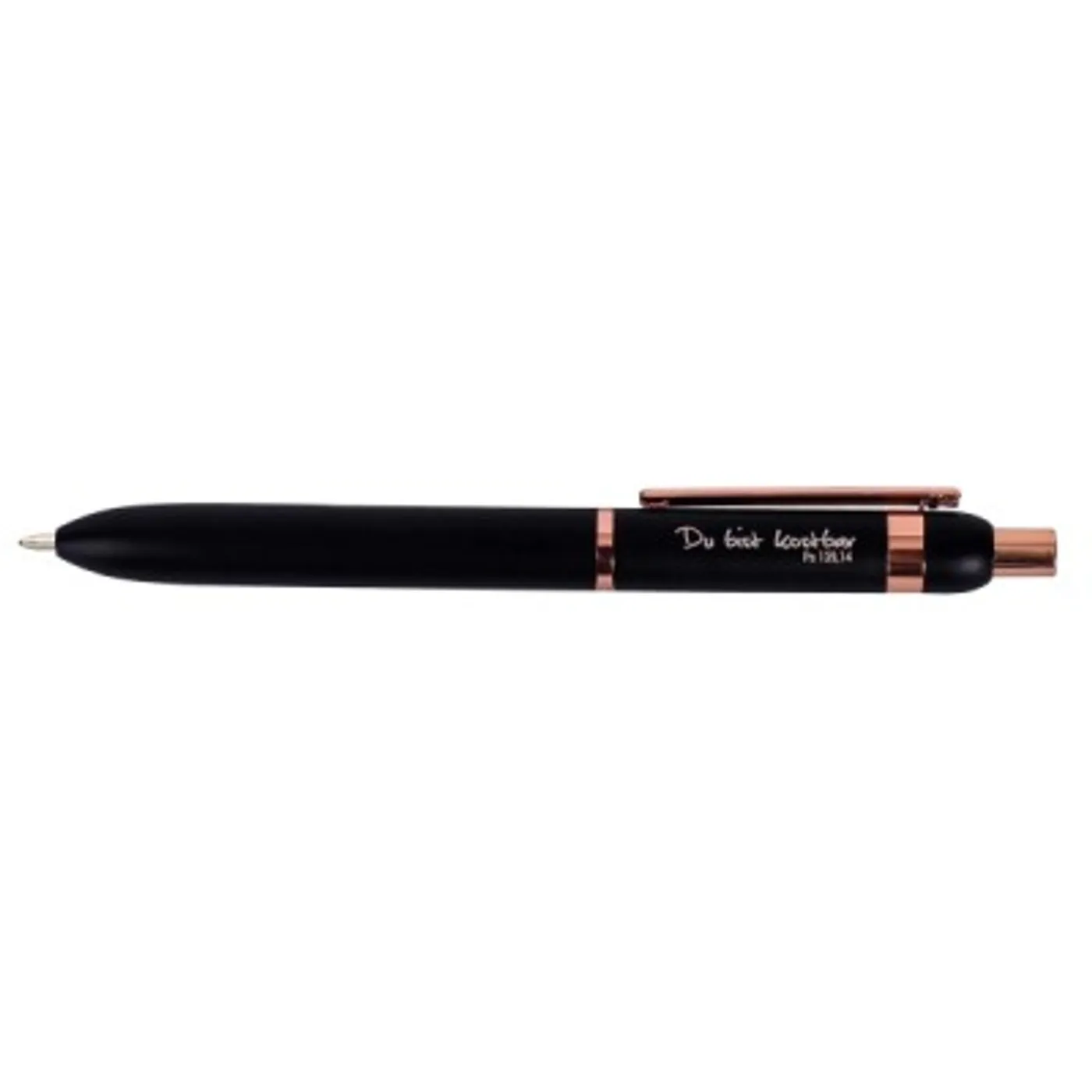 In matt-schwarzem Look überzeugt der elegante Metall-Kuli „Leah“ mit den roségoldfarbenen Akzenten und der Metall-Großraummine. Graviert ist der schöne Kuli mit dem Vers „Du bist kostbar Ps 139,14“.