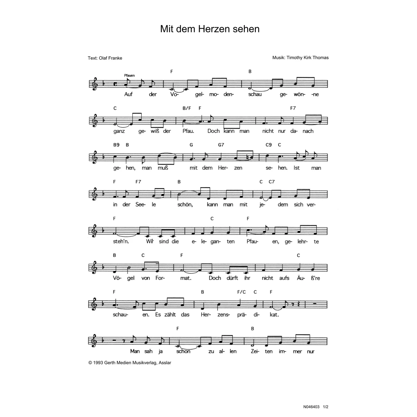 Mit dem Herzen sehen (diese Variante haben Sie gerade ausgewählt) (einstimmig, mit Akkorden, F-Dur) Tim Thomas (Komposition), Olaf Franke (Text) |
