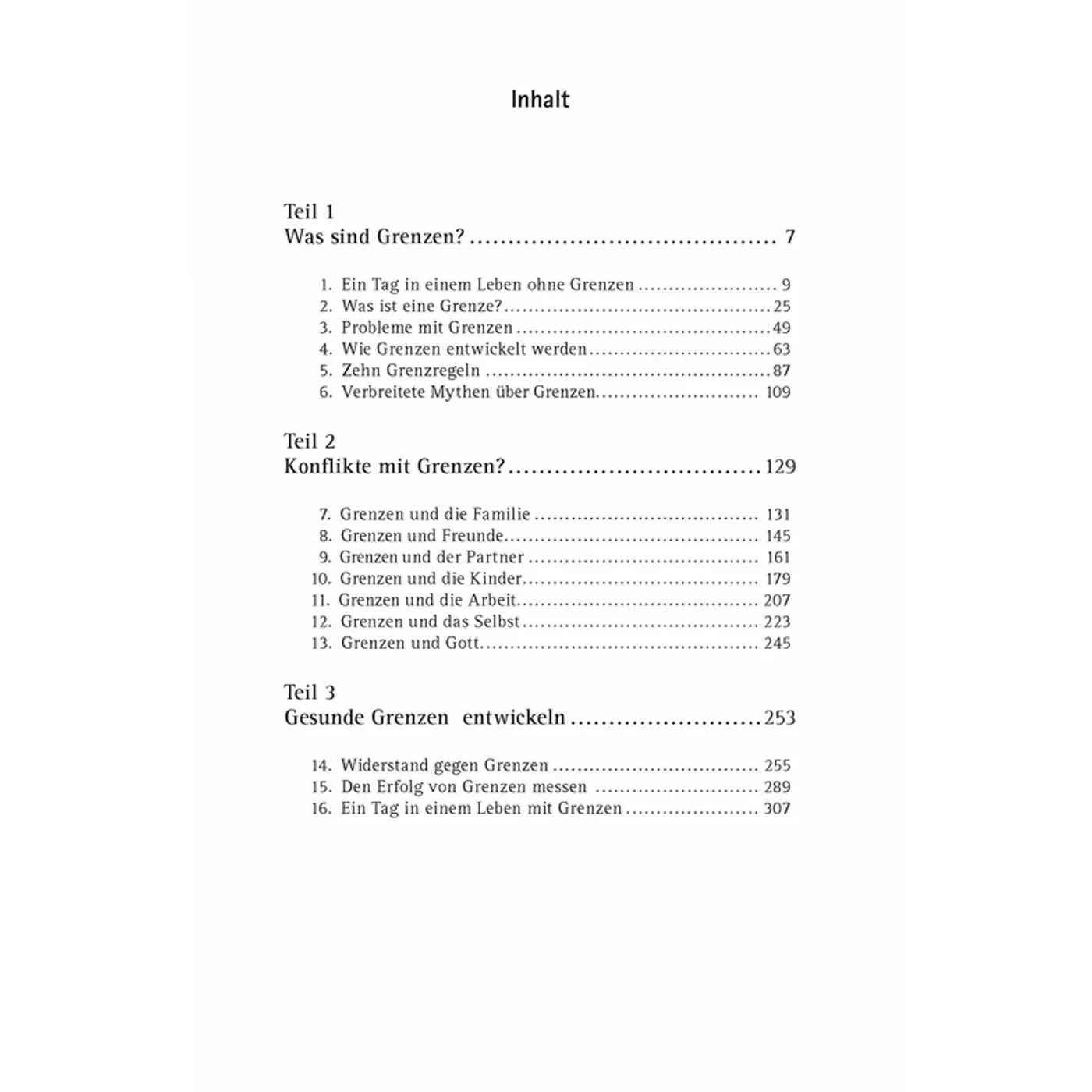 Man erfährt Schritt für Schritt, wie Grenzen entwickelt werden, lernt zehn Grenzregeln kennen, aber auch verbreitete Mythen. (Wie zum Beispiel, dass man egoistisch ist, wenn man Nein sagt oder andere damit zwangsläufig verletzt.)