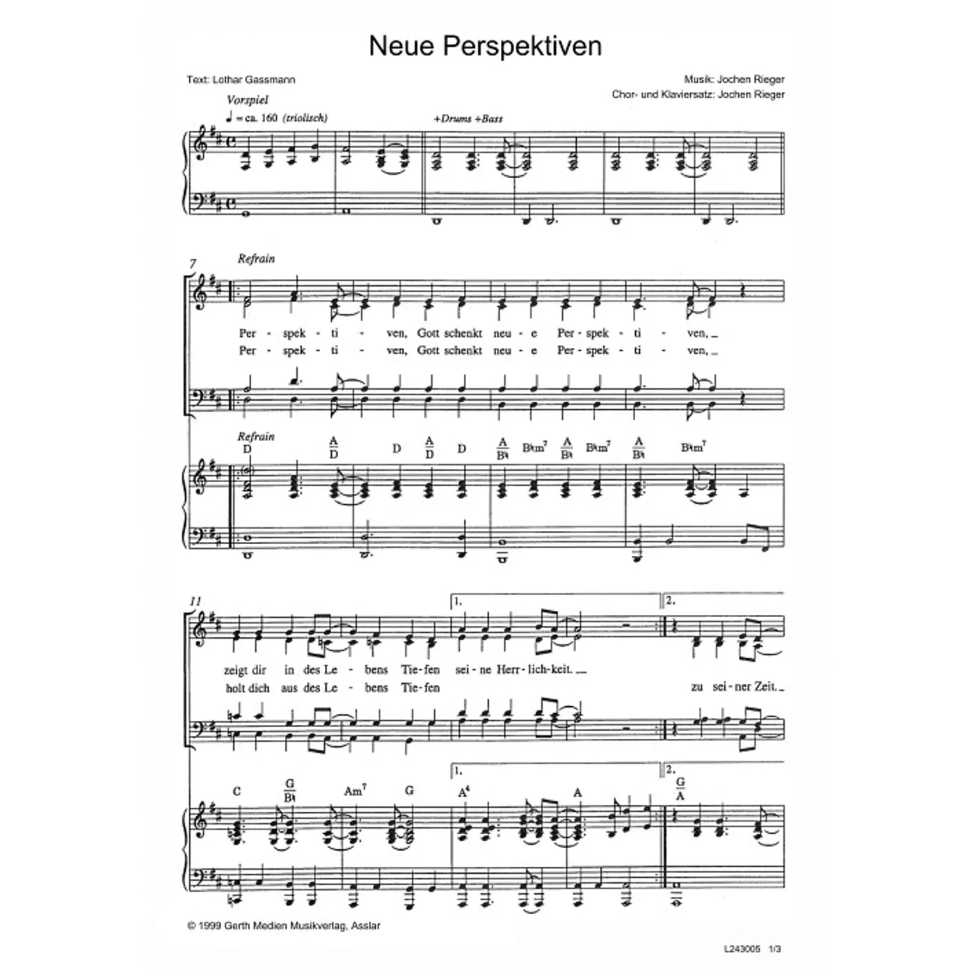 Neue Perspektiven (modern, gemischter Chor, mit Akkorden, vierstimmig, D-Dur) Lothar Gassmann (Text), Jochen Rieger (Komposition, Chorsatz) | modern, gemischter Chor, mit Akkorden, vierstimmig, D-Dur | 1,50 € |