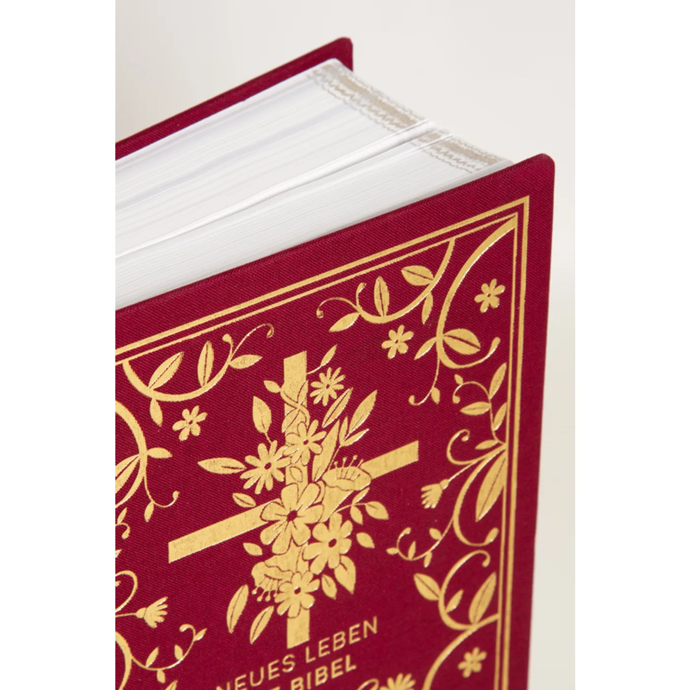 Die Seiten sind etwas dicker als bei gewöhnlichen Bibelausgaben, was gut zur sonstigen Gestaltung passt und das Gewicht von etwa anderthalb Kilogramm erklärt. Der goldene Zierrand, der sich auf jeder Doppelseite findet, passt gut zum Aussehen der Bibel und verstärkt das Gefühl, in einem kostbaren Band zu lesen. Hilfreich sind die beiden Lesebändchen, eins in Gold, das andere passend zur Farbe des Einbands.