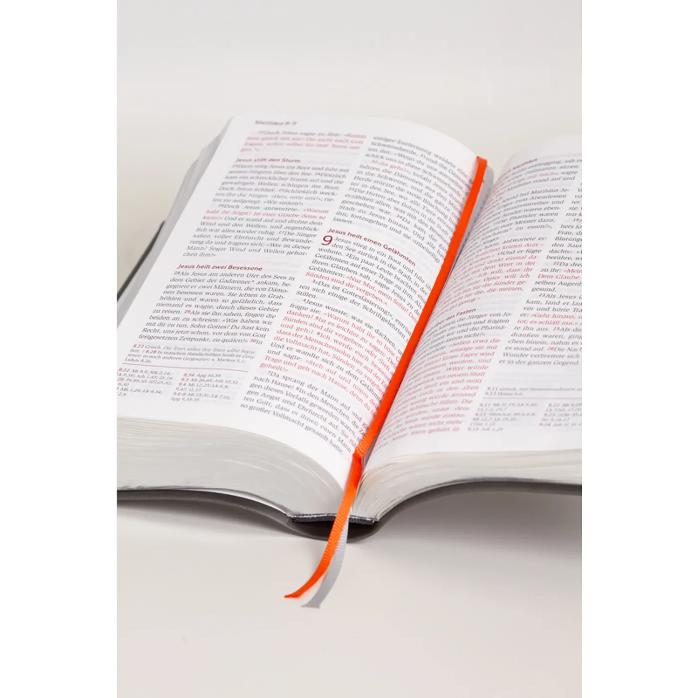 Ich bin leider enttäuscht worden, deswegen habe ich sie zurückgeschickt. Ich hatte sie bestellt, weil sie angeblich laut Leseprobe in Italien gedruckt wurde, aber diese sind jetzt aus China. Man merkt es an der Papierqualität. Auch die rote Schrift ist für mich nichts. Das schwarz scheint durch. Ich bin auch dafür so etwas nicht zutun, da die ganze Bibel Gottes Wort ist und alles gleichwertig zu sehen ist. Wer die Qualität von Schlachter 2000 oder CSV gewöhnt ist wird hier denke ich nicht glücklich. Der Einband ist sehr schön, aber der Silberschnitt färbt im ersten Moment ab, was auch nicht sein darf. SCM hat die Retoure Kosten ohne Probleme übernommen. 1 Stern für den Einband und 1 Stern für die Rückabwicklung von SCM. Fazit: keine Empfehlung