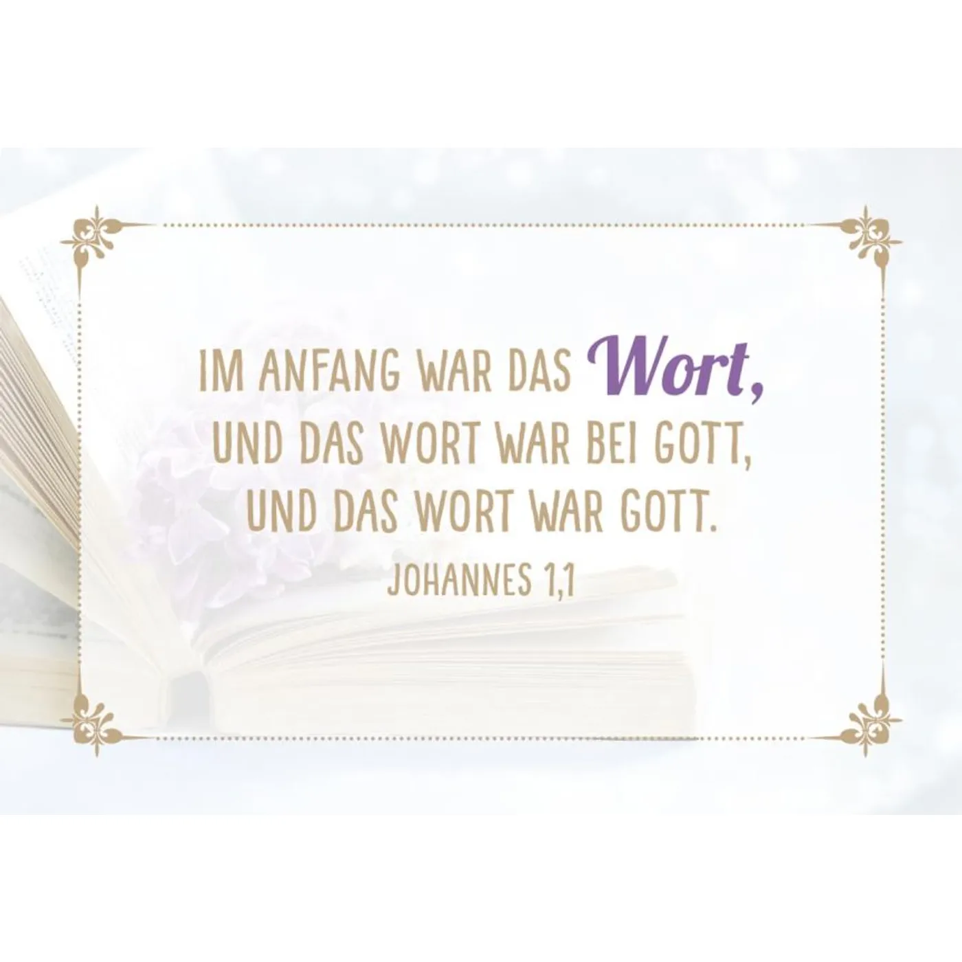 Jedes der 100 Kärtchen ist mit einem sanften, stimmungsvollen Bildmotiv oder einer feinen Illustration versehen. Auf der Vorderseite findest du jeweils eine Bibelversangabe, z.B. Johannes 15,12. Beim Umdrehen offenbart sich der vollständige Bibelvers – etwa: