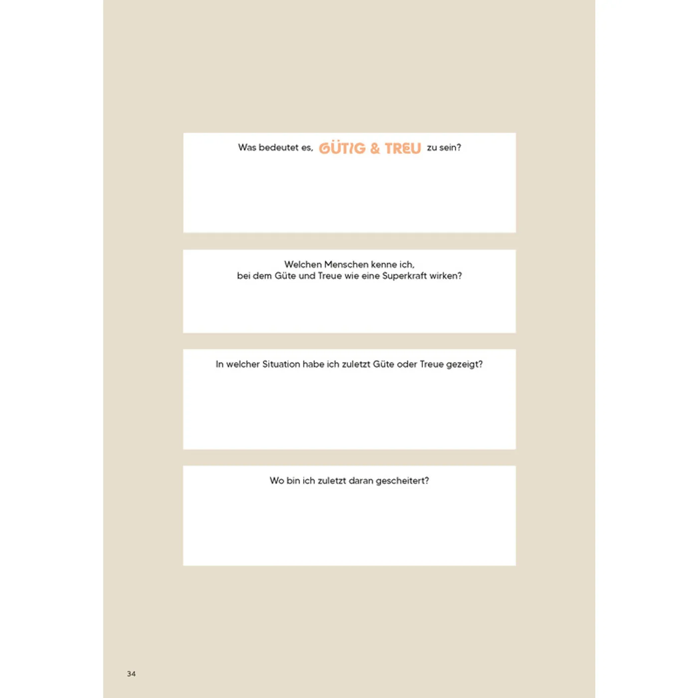 Jedes Kapitel beginnt mit einer passenden Überschrift. Anschließend liest man das entsprechende Sprüche-Kapitel und beantwortet direkt daneben oder darunter verschiedene Fragen – dafür gibt es extra Platz zum Ausfüllen. Besonders schön finde ich die Rubrik „Dieser Vers hat mich am meisten berührt“. Hier kann man seine Gedanken ganz persönlich festhalten und wird sogar ein Stück weit kreativ.