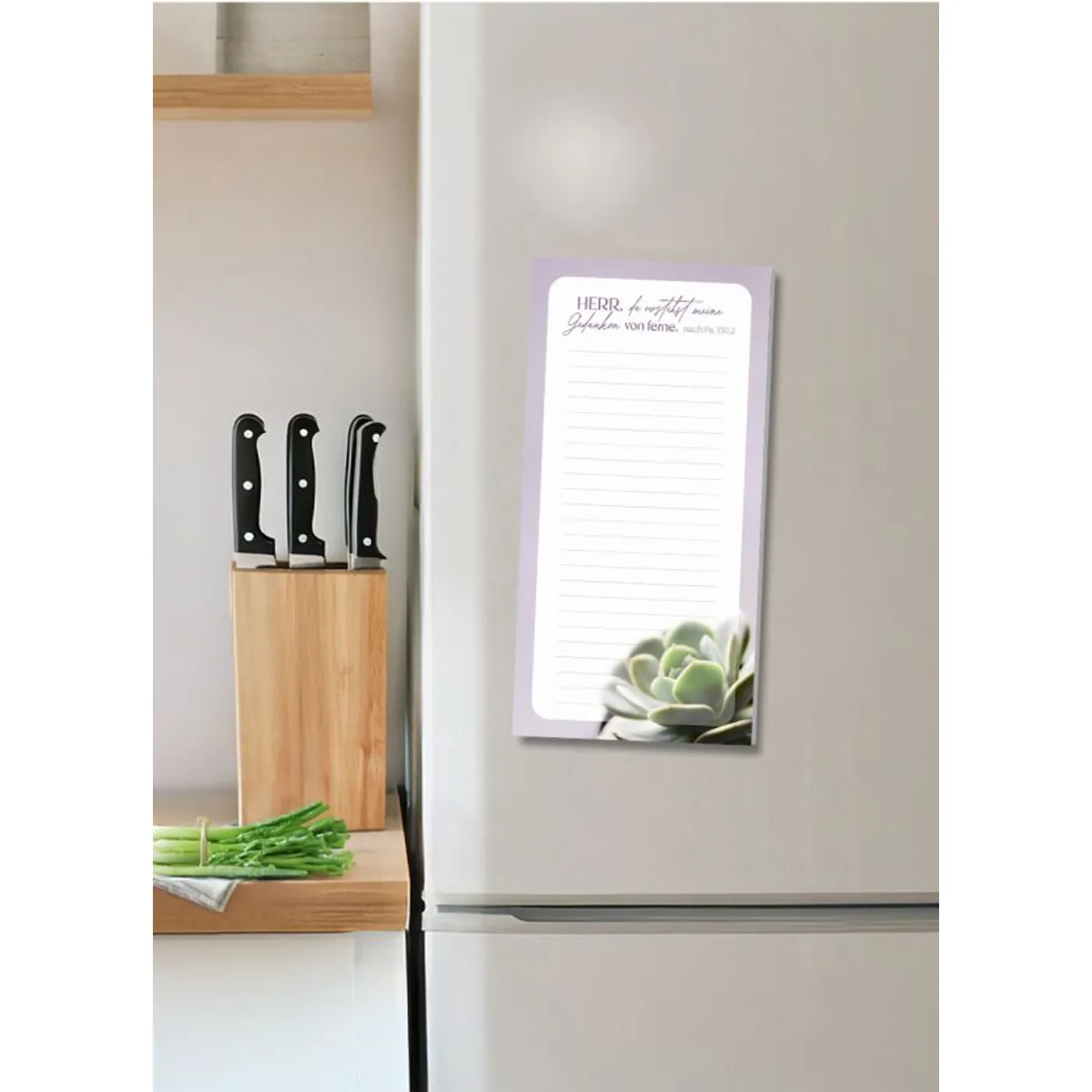 Entdecke den stilvollen Notizblock “Notizen – Raum für deine Gedanken” aus der beliebten Fatzer floral Kollektion. Mit seinem schlichten, eleganten Design und der Illustration einer Sukkulente ist er ein echter Hingucker. Jeder der 50 Blätter enthält 24 Zeilen und den inspirierenden Bibelvers nach Psalm 139:2: “Herr, du verstehst meine Gedanken von ferne.” – eine beständige Erinnerung daran, dass Gott jeden deiner Gedanken kennt.