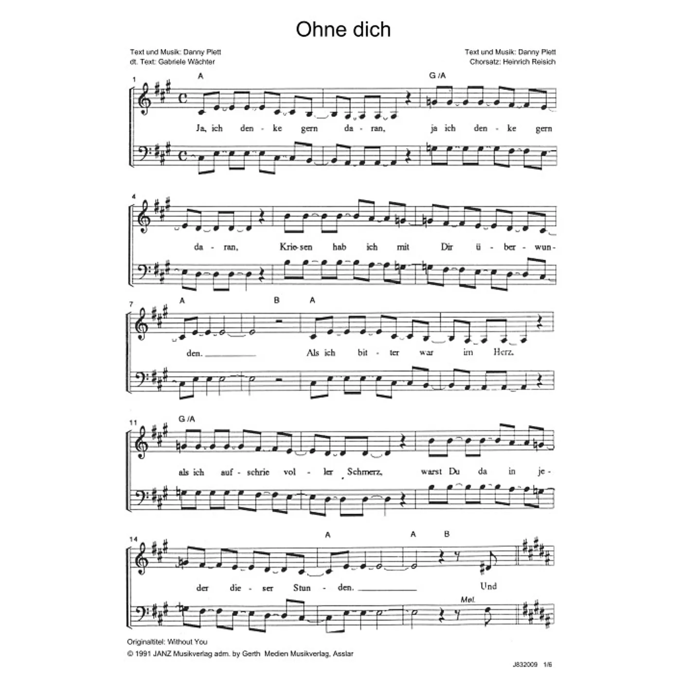 Ohne dich (diese Variante haben Sie gerade ausgewählt) (modern, dreistimmig, gemischter Chor, mit Akkorden, A-Dur) Danny Plett (Komposition, Text), Heinrich Reisich (Chorsatz), Gabriele Wächter (Übersetzung) |