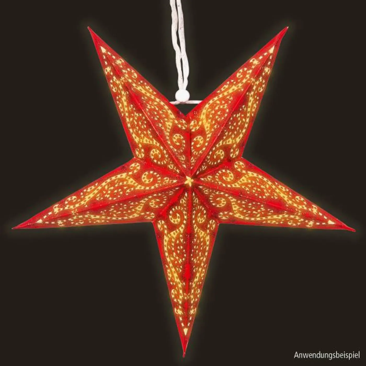Eine schöne Deko-Idee für z.B. am Fenster, im Treppenhaus...! Papier-Stern in rot mit 5 Zacken, das ornamentale Muster aufwändig mit Glitter verziert. Nette kleine Geschenkidee für die Nachbarin, Kollegin ... oder Überraschung im Adventskalender.