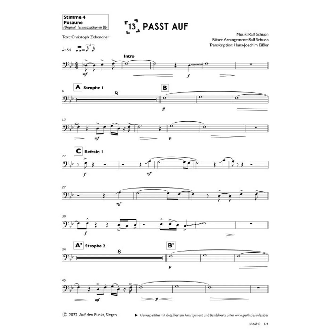 Passt auf (4. Posaune) (diese Variante haben Sie gerade ausgewählt) (Gemeindelied, Bläser, Orchestereinzelstimme, B-Dur) Christoph Zehendner (Text), Hans-Joachim Eißler (Bläsersatz), Ralf Schuon (Komposition, Bläsersatz) |