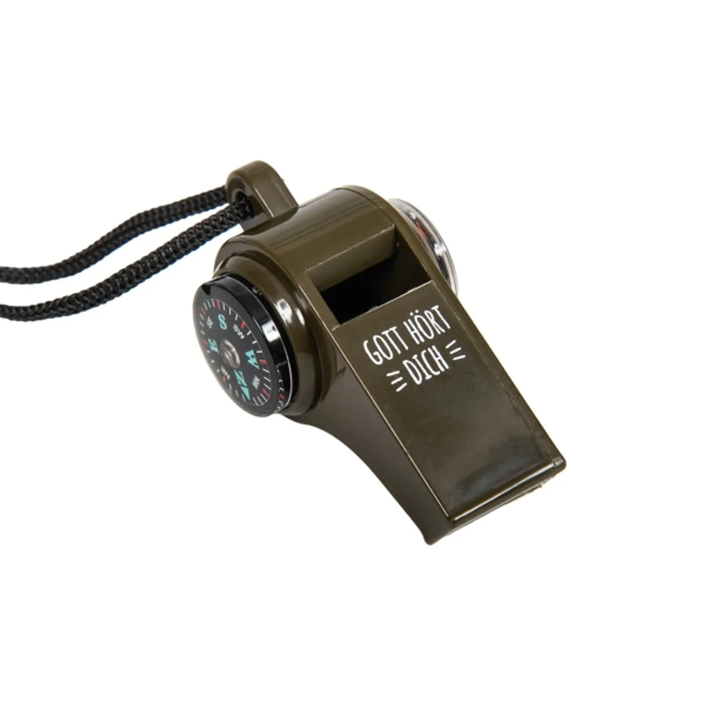 Pfeife mit Kompass und Thermometer mit Text: "Gott hört dich".
