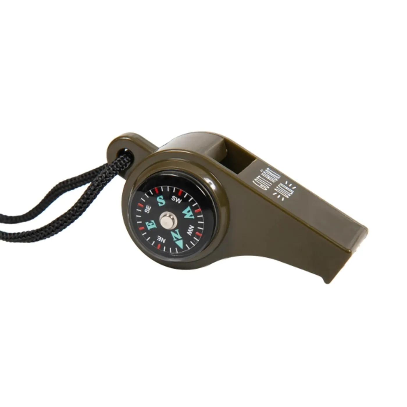 Pfeife aus Kunststoff (90 dB), auf einer Seite mit einem Kompass und auf der anderen Seite mit einem Thermometer ausgestattet. Inkl. 100 cm Polyesterband mit ABS-Sicherheitsschnalle.