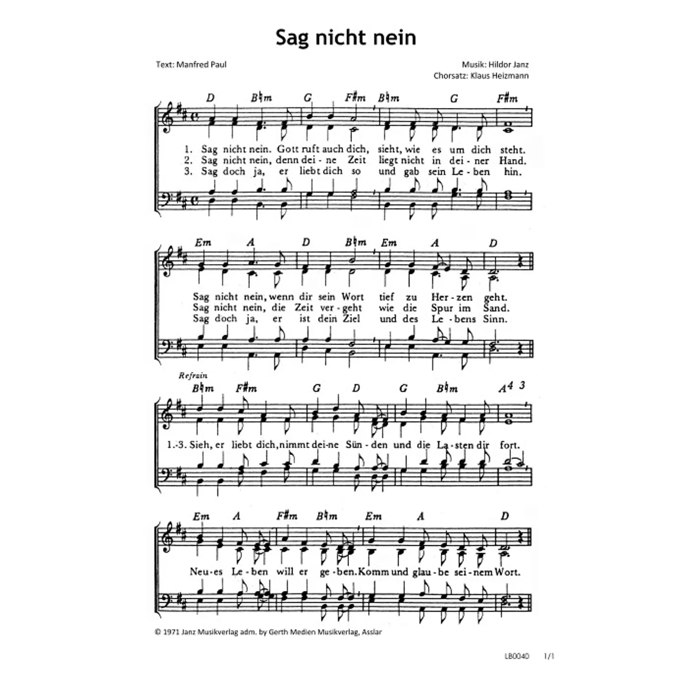 Sag nicht nein (diese Variante haben Sie gerade ausgewählt) (traditionell, gemischter Chor, mit Akkorden, vierstimmig, D-Dur) Hildor Janz (Komposition), Manfred Paul (Text), Klaus Heizmann (Bearbeiter) |