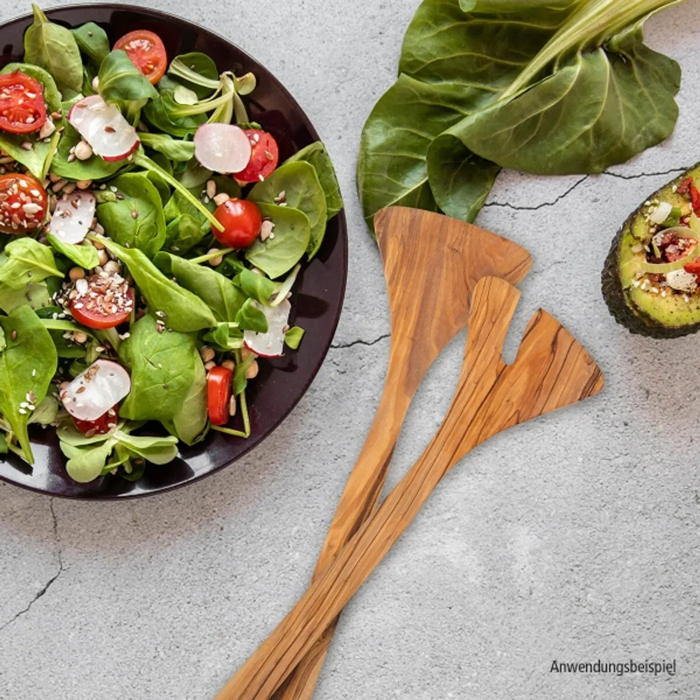 Pflegehinweis: Reinigen Sie das Salatbesteck aus Olivenholz mit lauwarmem Wasser und einem milden Reiniger, trocknen Sie es sofort gründlich ab und vermeiden Sie Spülmaschine und Einweichen. Pflegen Sie es gelegentlich mit etwas Speiseöl (Olivenöl oder Leinöl), um das Holz geschmeidig zu halten.