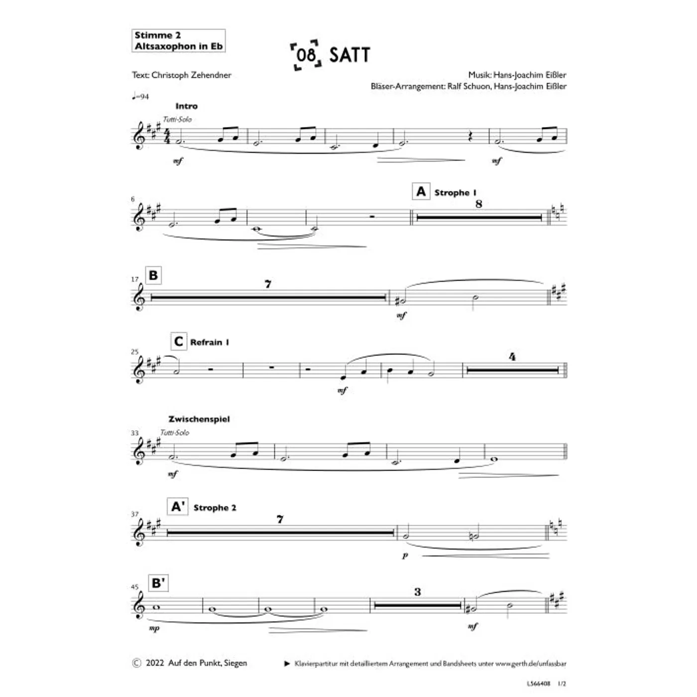 Satt (Altsaxophon in Eb) (diese Variante haben Sie gerade ausgewählt) (Gemeindelied, Bläser, Orchestereinzelstimme, a-moll-Moll) Hans-Joachim Eißler (Komposition, Bläsersatz), Christoph Zehendner (Text), Ralf Schuon (Bläsersatz) |