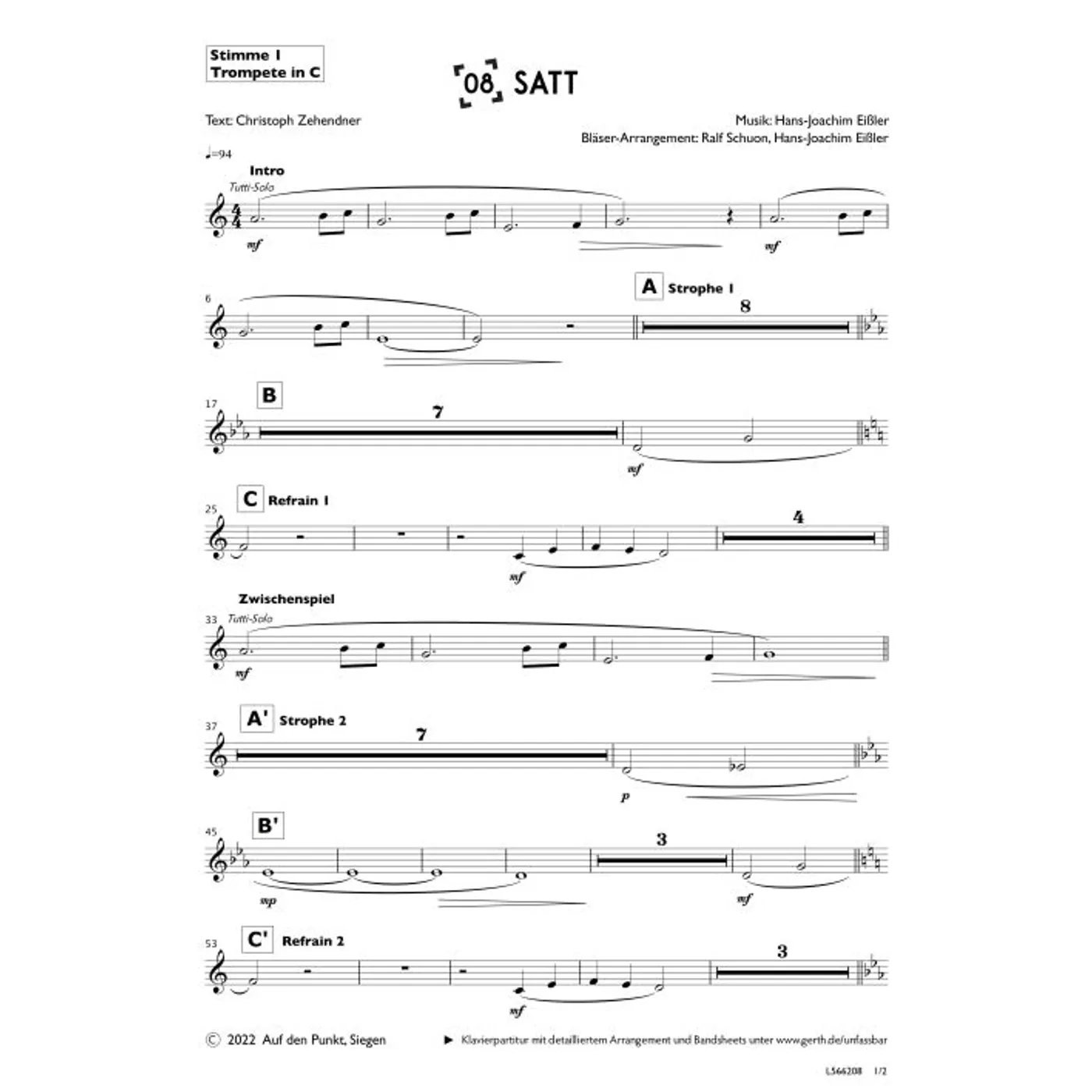 Satt (1., Trompete in Bb) (Gemeindelied, Bläser, Orchestereinzelstimme, a-moll-Moll) Hans-Joachim Eißler (Komposition, Bläsersatz), Christoph Zehendner (Text), Ralf Schuon (Bläsersatz) | Gemeindelied, Bläser, Orchestereinzelstimme, a-moll-Moll | 2,80 € | ||