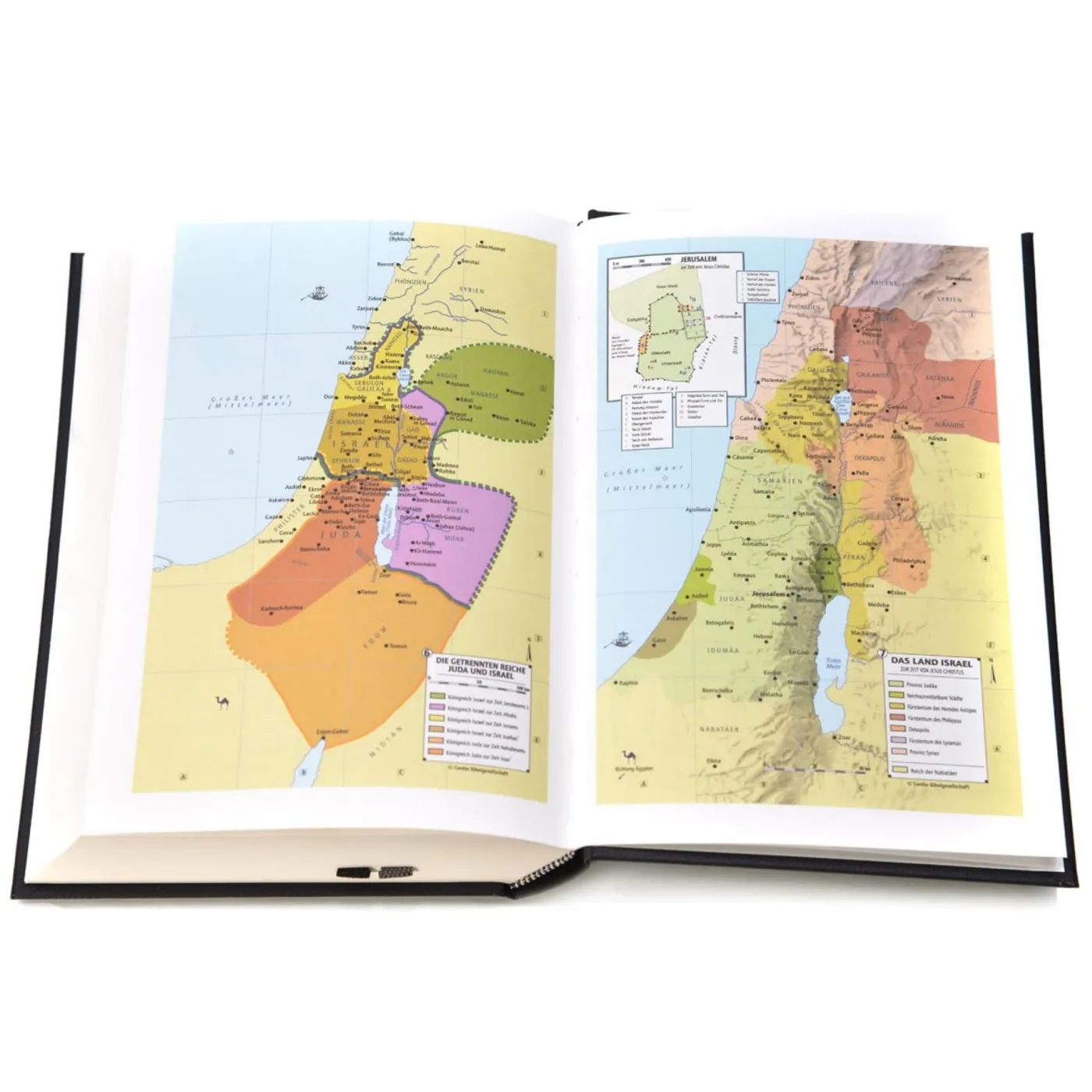 Neben Überschriften zur Kapitelübersicht, Parallelverweisen und textlichen Anmerkungen beinhaltet diese kompakte Ausgabe einen ausführlichen Anhang mit Sach- und Worterklärungen, Diagrammen und Tabellen, diversen Abbildungen, farbigen Karten sowie verschiedenen Bibelleseplänen.