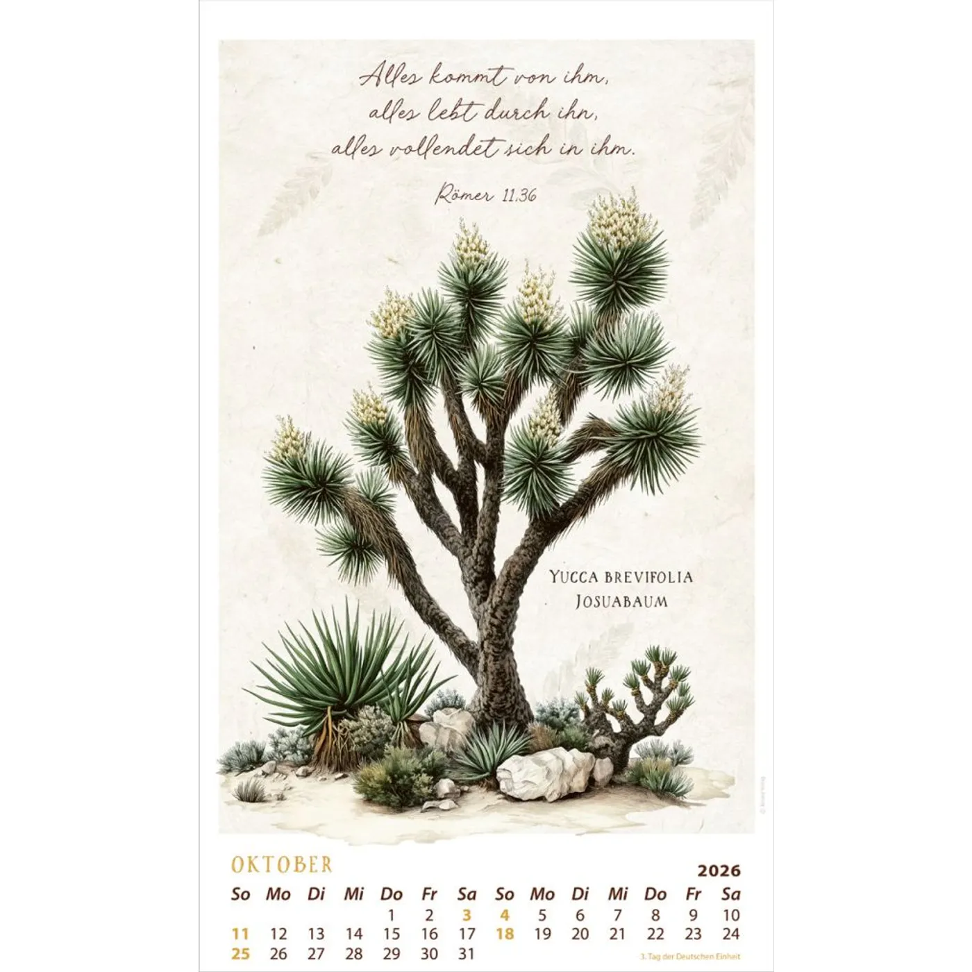 Jede detailreiche Zeichnung wird von kraftvollen Bibelversen begleitet, die nicht nur zum Staunen einladen, sondern auch zur Besinnung und Reflexion anregen. Mit einem eleganten Format von 29 x 49 cm wird dieser Kalender zu einem stilvollen Blickfang in Deinem Zuhause und bereichert jeden Raum mit seiner künstlerischen Schönheit.