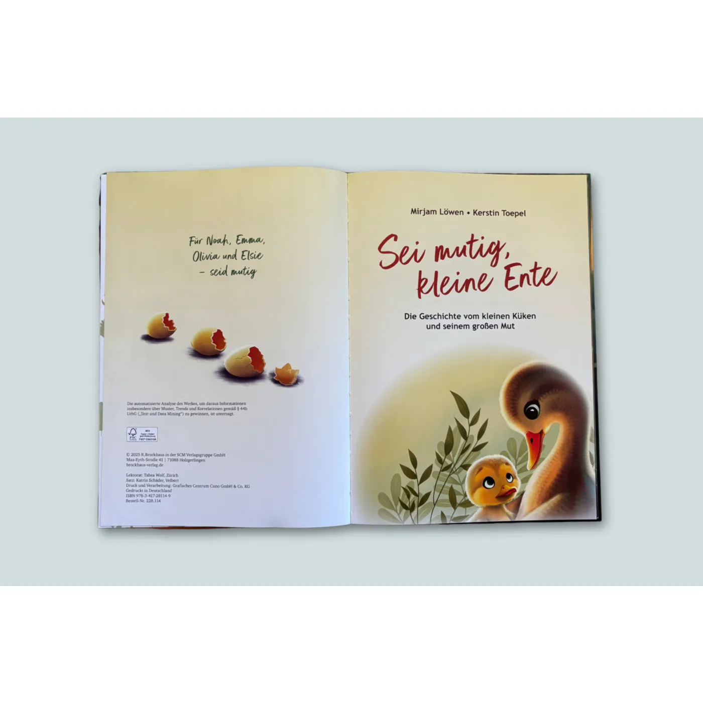 Das Buch „Sei mutig, kleine Ente“ handelt von einer Entenfamilie, in der ein kleines Küken (Anouk) sich nicht aus dem Nest und in das Wasser traut. Es geht um Zweifel und den Zuspruch der Mutter mit Bezug auf Josua 1, 9 aus der Bibel. Die Geschichte an sich gefiel uns sehr gut, wobei es auf manchen Seiten sehr viel Text war zumindest für jüngere Kinder.