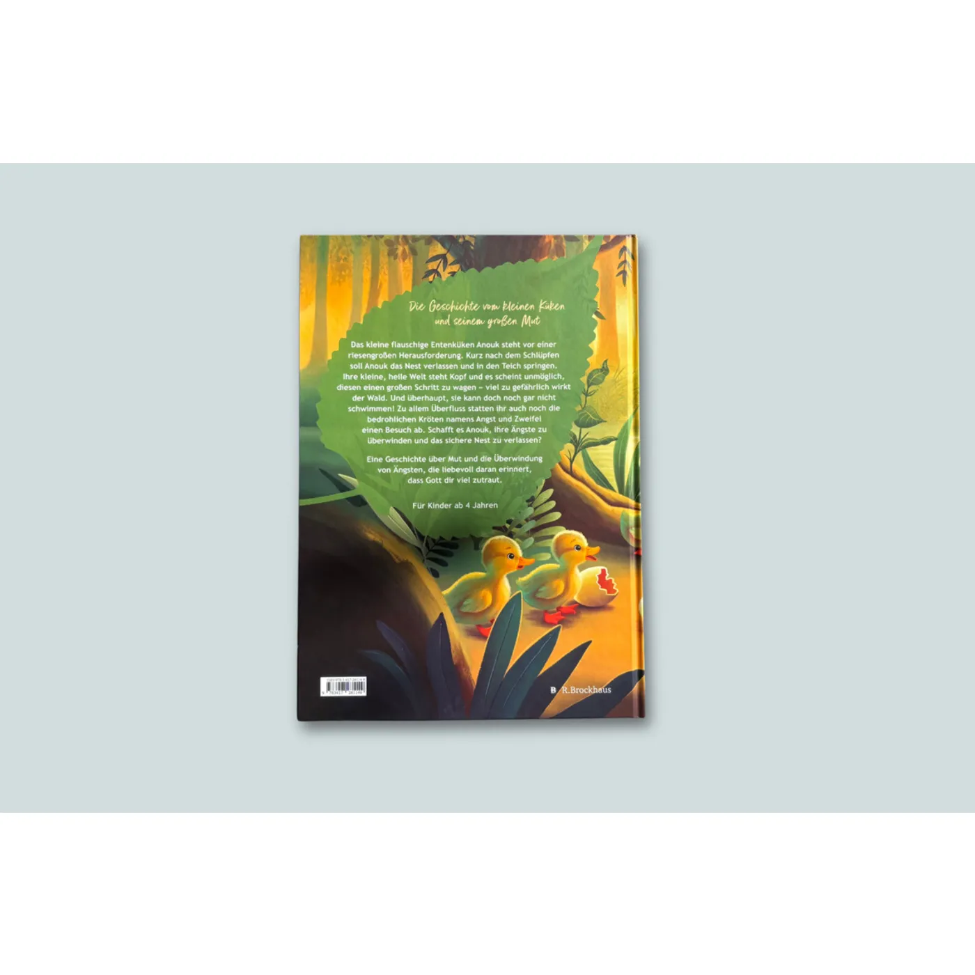 Anouk, das kleine Entenküken, möchte lieber im kuscheligen Nest bleiben und nicht mit ihren Entengeschwistern und der Mutter zum Teich gehen. Das Wasser ist nass und kalt und bedrohlich und ungewohnt. Nichts für Anouk. Als die Ente allein zurückbleibt, kommen zwei Kröten zu Besuch, die Anouk in ihrem Beschluss bestärken und vor den Gefahren am Teich warnen. Die Kröten heißen Angst und Zweifel. Anouks Entenmama sucht Anouk und möchte wissen, was los ist. „Du kannst das Anouk! Du kannst mutig sein und schwimmen! Du wirst den Teich lieben, wenn du dich einmal traust.“ Anouk geht mit zum Wasser, überwindet sich, springt und mag das neue Leben am Teich. Zitat: „Einmal musste Anouk mutig sein, einmal ganz besonders mutig sein und einen kleinen Schritt wagen. Aber wenn wir wissen, dass Gott uns mutig und stark findet und sagt, wir sollen uns nicht erschrecken lassen, dann ist das genug. Das reicht, um einen wichtigen Schritt voller Mut zu schaffen.“