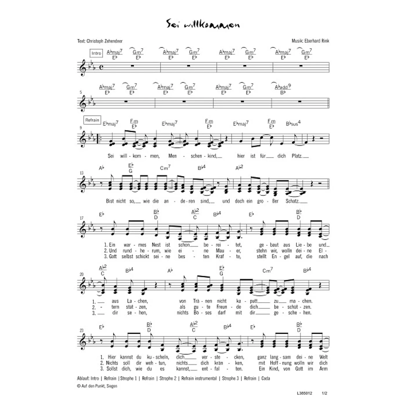 Sei willkommen (diese Variante haben Sie gerade ausgewählt) (modern, gemischter Chor, mit Akkorden, vierstimmig, Es-Dur) Eberhard Rink (Komposition), Christoph Zehendner (Text) |