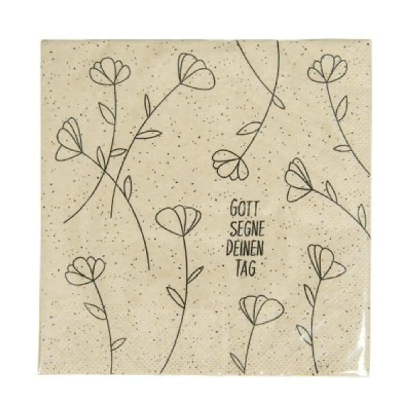 Schöne Servietten mit dezentem einfarbigen Blumenmotiv und passendem Text: "Gott segne Deinen Tag".