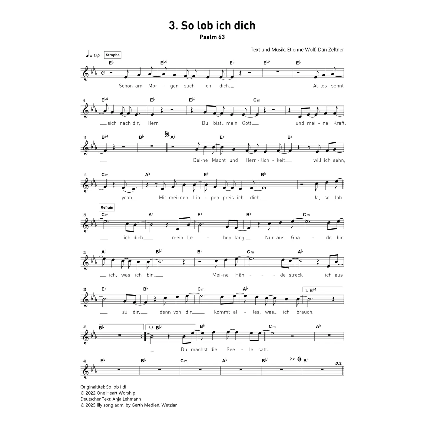 So lob ich dich (diese Variante haben Sie gerade ausgewählt) (Worship, einstimmig, Es-Dur) Anja Lehmann (Dt. Text), Etienne Wolf (Text, Melodie), Dän Zeltner (Melodie, Text) |