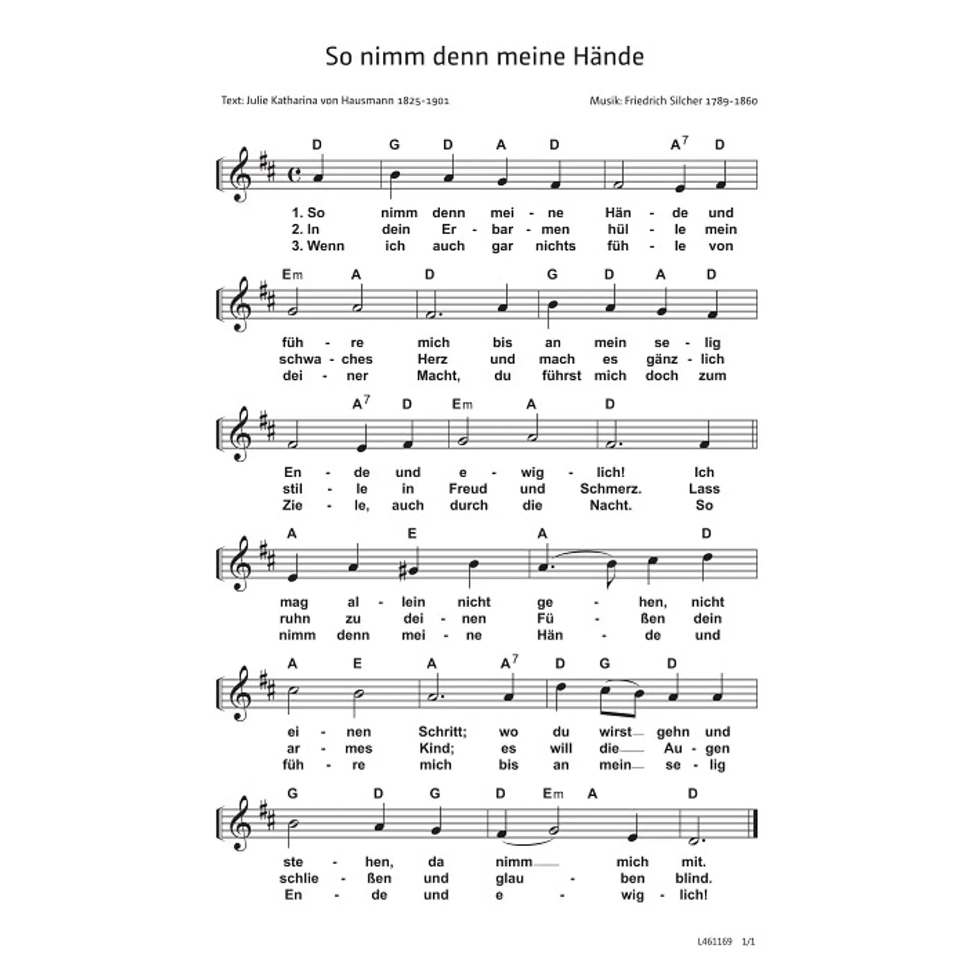 So nimm denn meine Hände (diese Variante haben Sie gerade ausgewählt) (Gemeindelied, traditionell, einstimmig, mit Akkorden, D-Dur) Friedrich Silcher (Komposition), Julie Katharina von Hausmann (Text) |