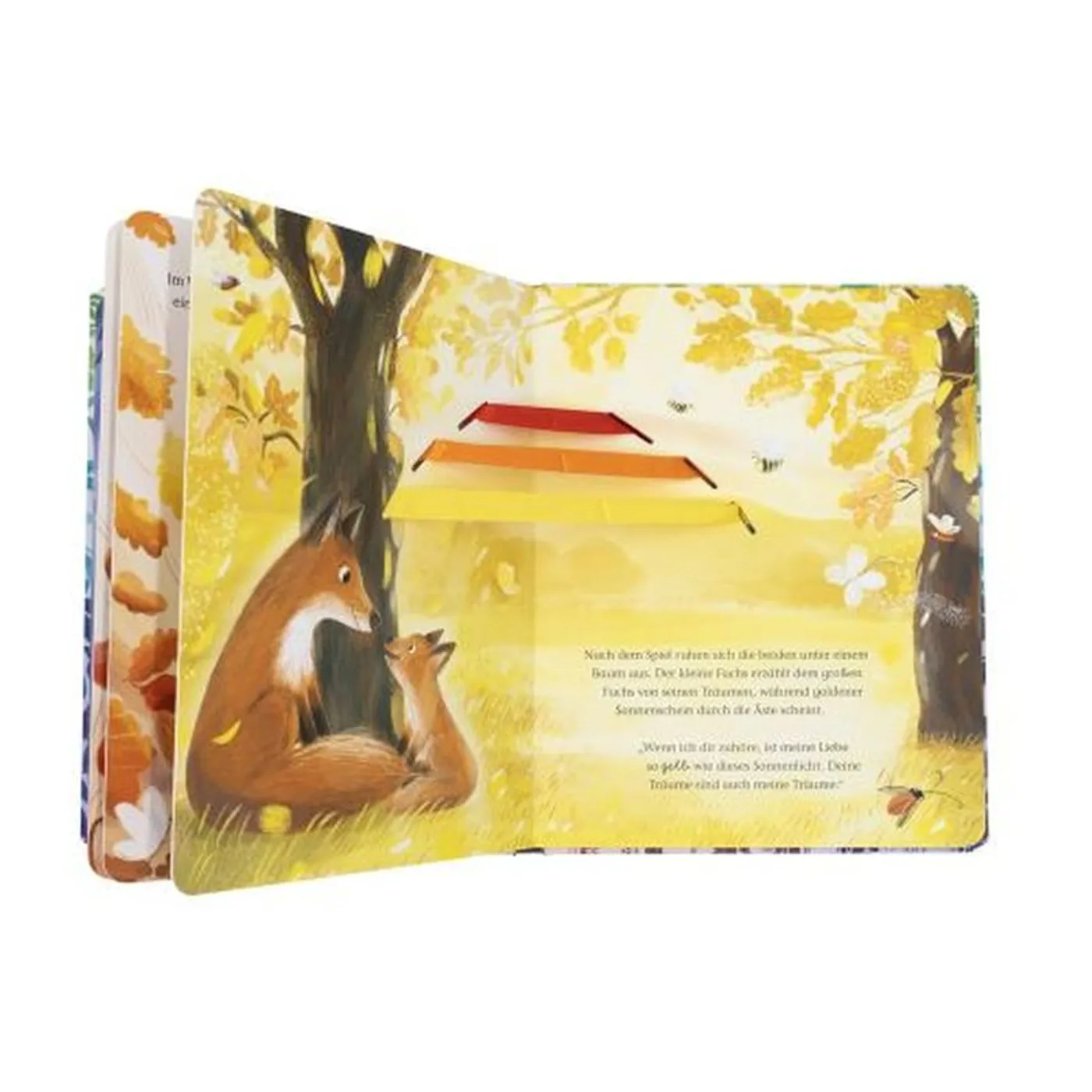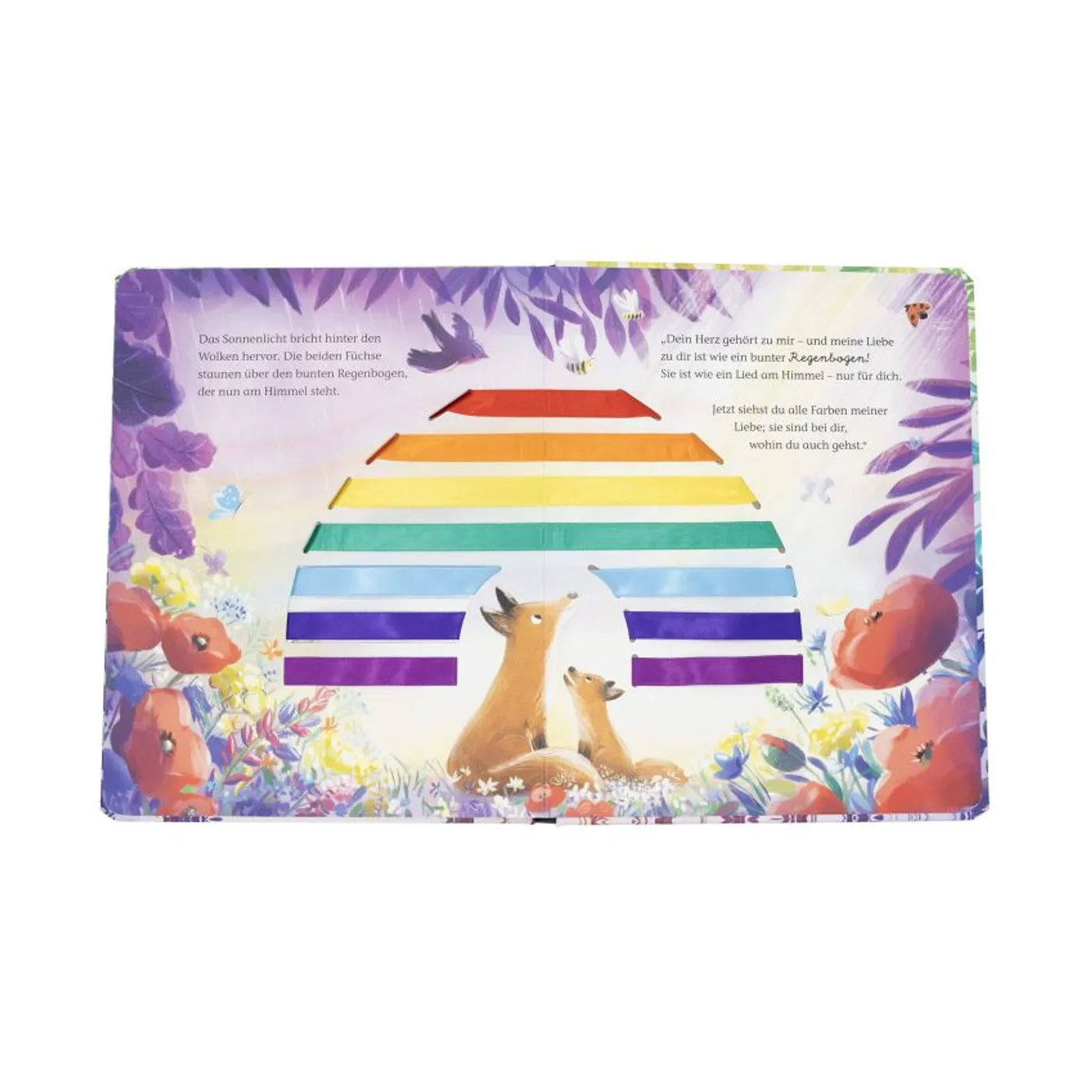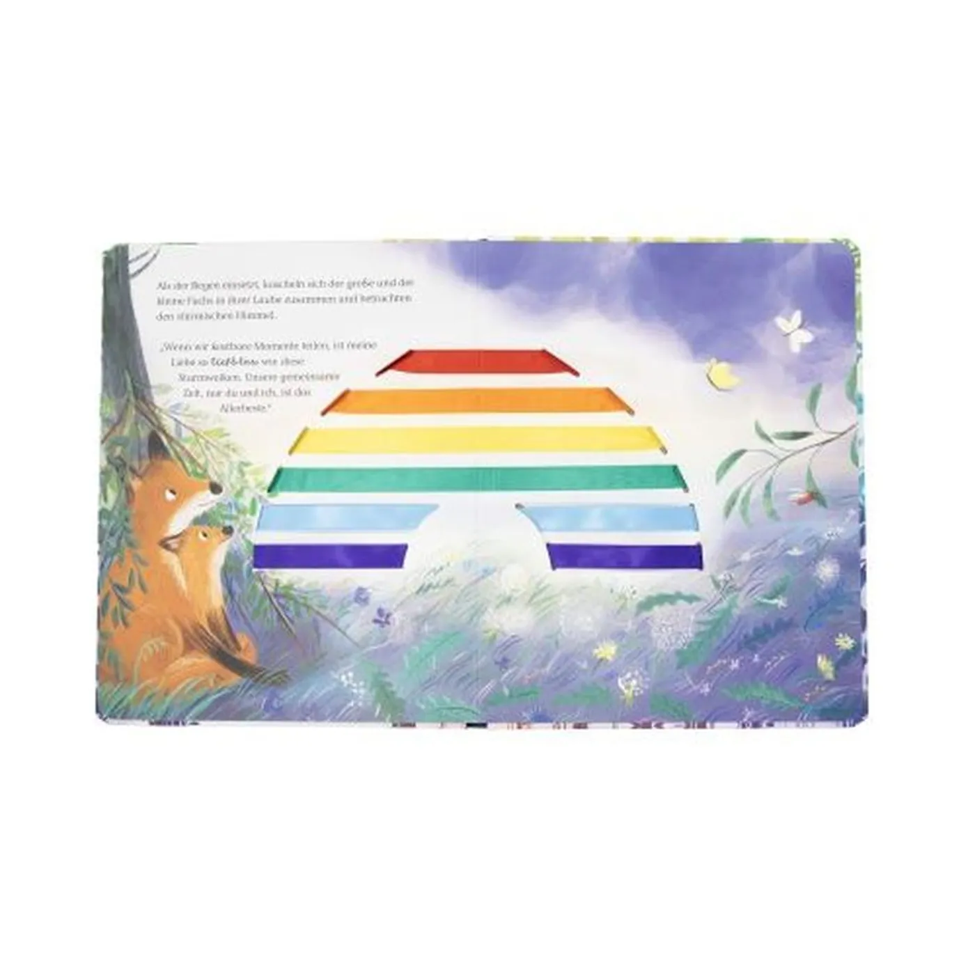 Als Besonderheit hat das Bilderbuch 7 verschiedenfarbige Bändchen, welche sich durch die Doppelseiten ziehen und nach und nach zu einem vollständigen Regenbogen zusammengesetzt werden. Anhand der 7 verschiedenen Farben wird dem kleinen Fuchs vom großen Fuchs die Facetten seiner Liebe näher gebracht. So lernt der kleine Fuchs beispielsweise, dass die Liebe u.A. aus Mut, Geborgenheit und Freude besteht.