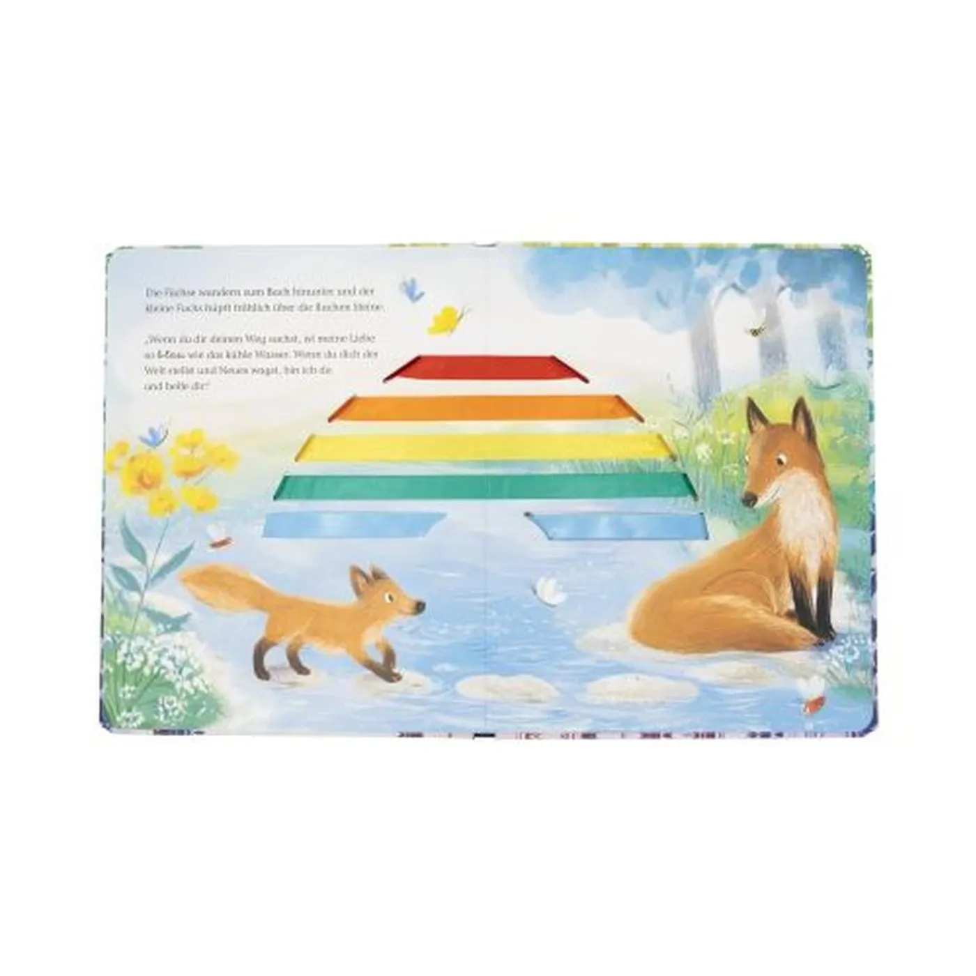 Dieses schöne Kinderbuch handelt von der Liebe zueinander und wie sich das in vielen Facetten in der Natur zeigt. Der große und der kleine Fuchs sind miteinander unterwegs und erleben gemeinsam schöne Dinge, wie z.B. Herumspringen in einem Laubhaufen. Zu jedem Ereignis erzählt der große Fuchs seinem kleinen Freund, dass seine Liebe so wie die entsprechende Farbe ist, z.B. so orange, wie die Blätter in dem Laubhaufen. Der besondere Clou an dem Buch ist, dass jede einzelne Farbe eine Farbe des Regenbogens widerspiegelt und diese durch ein glänzendes Band über die Seite gespannt ist. Mit jedem Umblättern kommt eine Farbe des Regenbogens hinzu und am Ende der Geschichte spannt sich der gesamte Regenbogen in Form der Bänder über die letzte Doppelseite. So kann das Kind die Geschichte nicht nur durch Sehen und Hören mitverfolgen, sondern auch durch Anfassen. Das ist ein haptisches Erlebnis, welches beim Kind alle Sinne fördert und die Geschichte wunderbar erlebbar macht. Ältere Kinder können die Geschichte selbst lesen; kleineren Kindern kann man vorlesen und ihnen zeigen, wie Seite für Seite der Regenbogen entsteht. So lässt sich ein Bogen schlagen zu Gottes Schöpfung und dass er uns ebenso liebt....