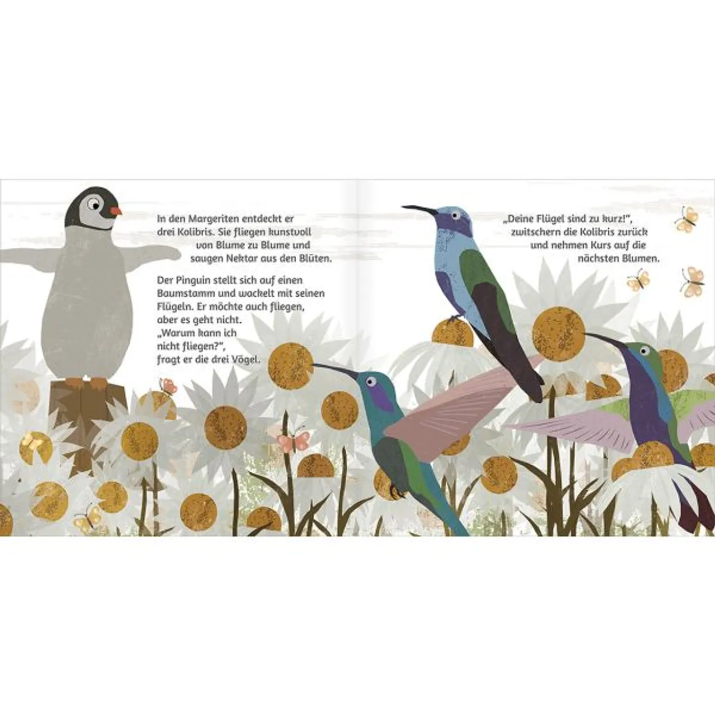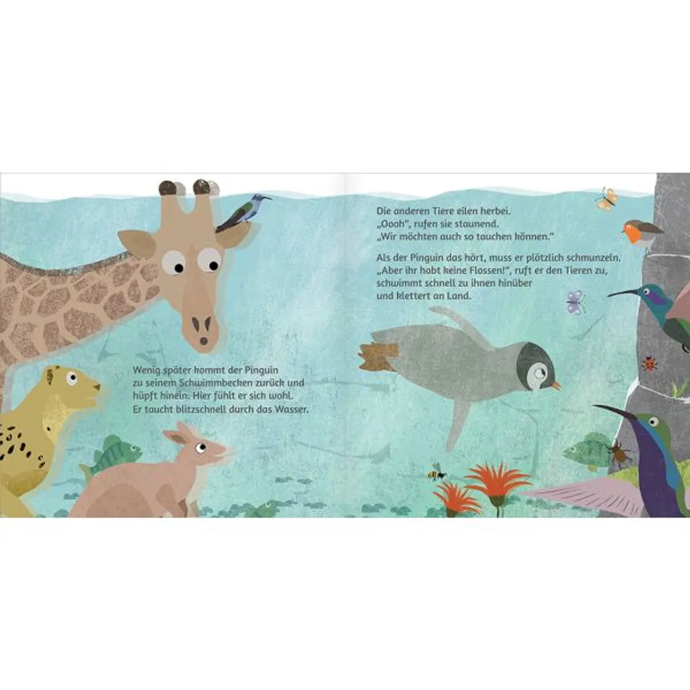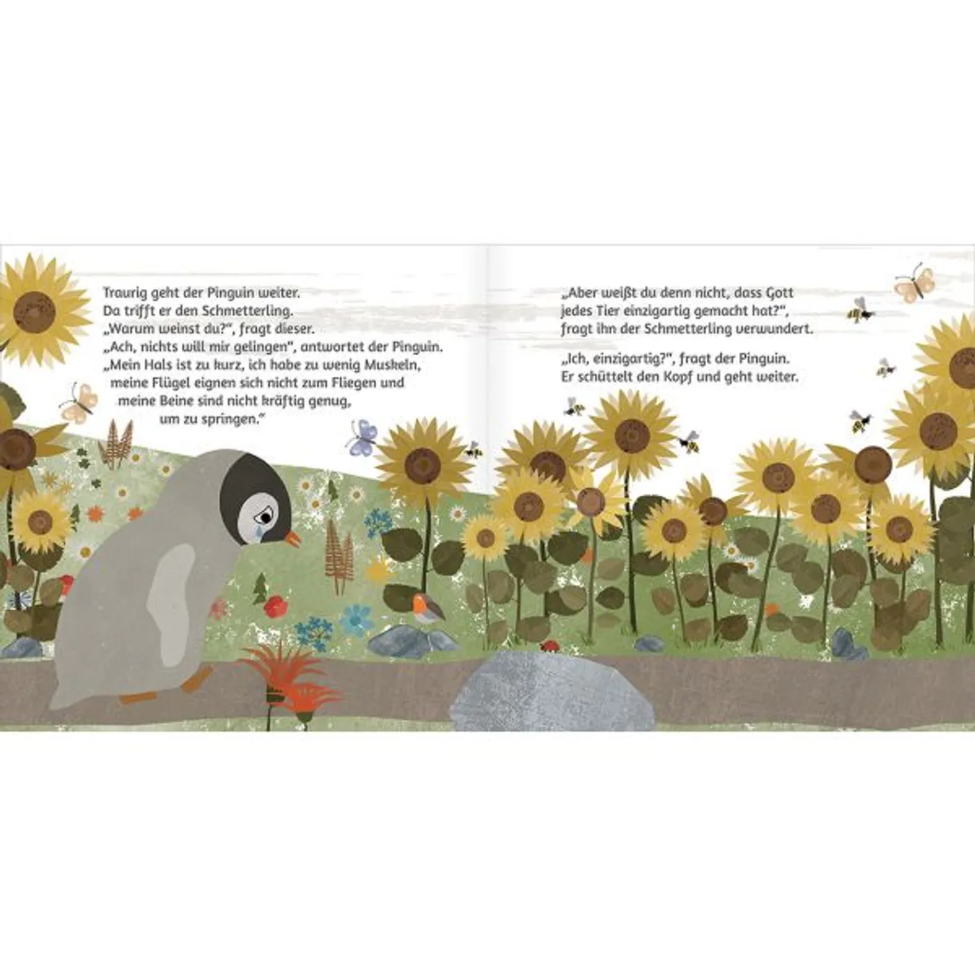 Ein kleiner Pinguin entdeckt voller Neugier die anderen Tiere seines Zoos. Dabei muss er feststellen, dass er sich mit keinem von ihnen messen kann. Traurig geht er zu seinem Schwimmbecken zurück und tut, was ihn wieder glücklich macht: Er taucht ab. Erst durch die erstaunten Gesichter der anderen Tiere, welche sich alle vor seinem Pool versammeln, wird ihm bewusst, was für ein wunderbares Talent er hat. Zufrieden erkennt er, dass es sich nicht lohnt, ständig nach den anderen zu schielen. In ihm schlummern einzigartige Fähigkeiten, die nur erkannt werden müssen. Gott hat ihn wunderbar gemacht.