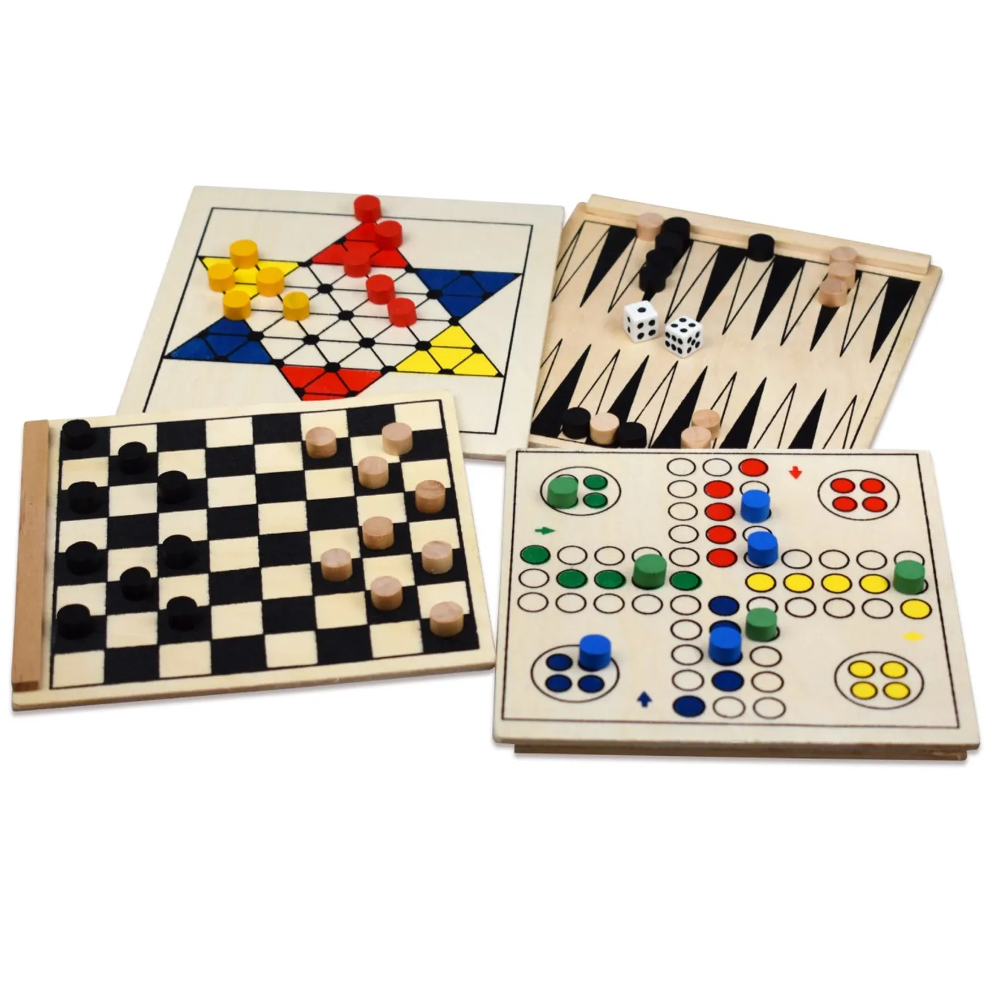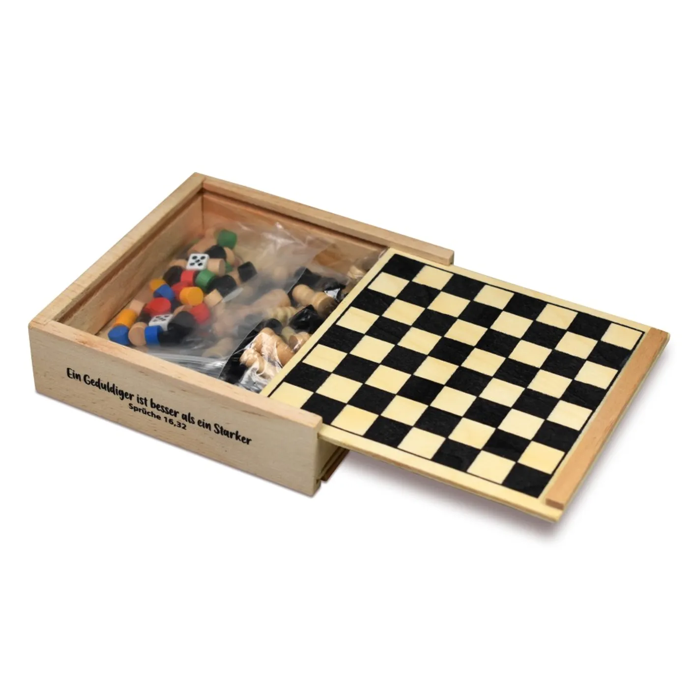Spiele-Box aus naturbelassenem Holz mit 5 Spielen: 12 x 12 cm, mit Spielfiguren aus Holz und Würfel. Die Spielbretter sind gleichzeitig die Schiebedeckel zum Verschließen der Holzbox. Textaufdruck "Ein Geduldiger ist besser als ein Starker"