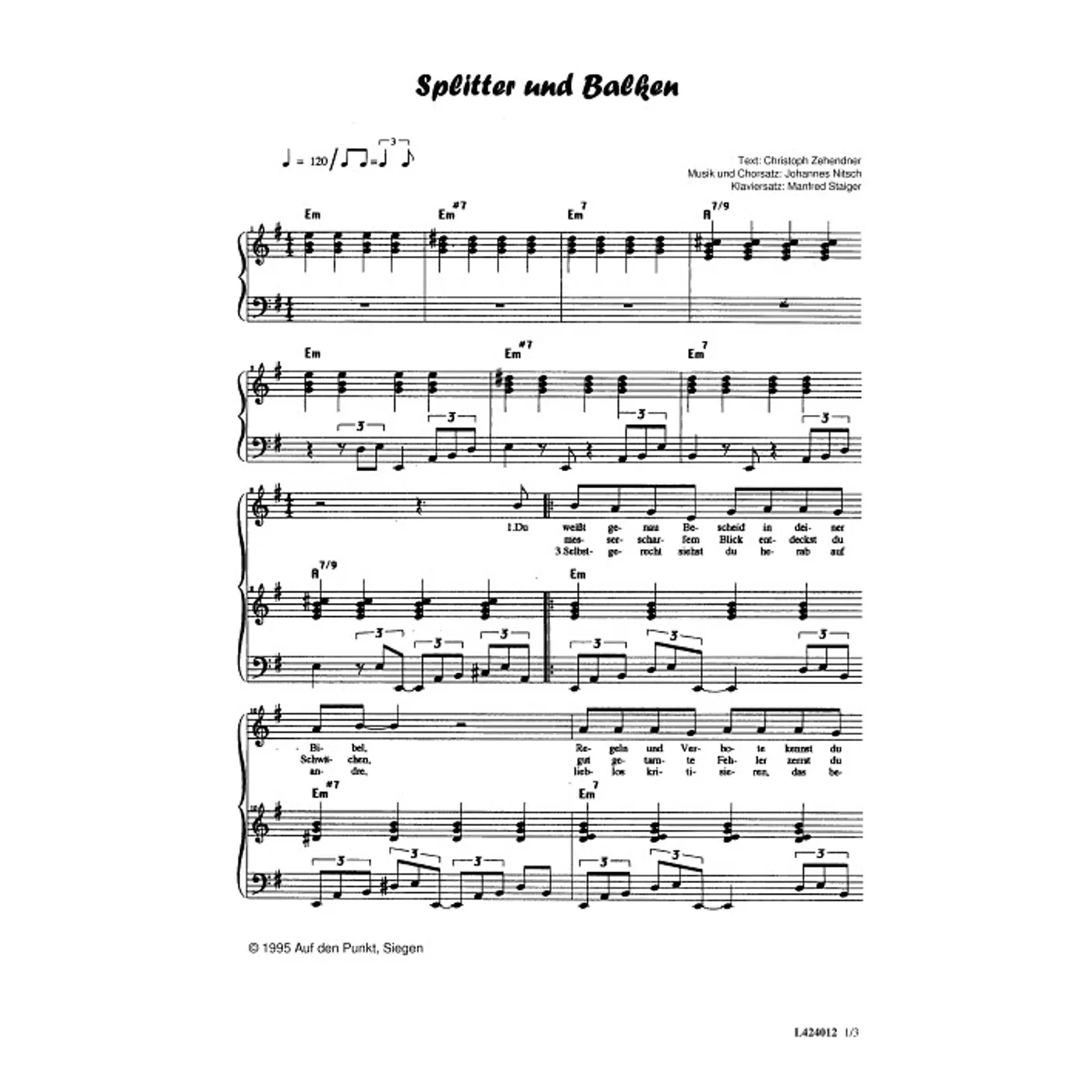 Splitter und Balken (diese Variante haben Sie gerade ausgewählt) (modern, Klavier, gemischter Chor, mit Akkorden, vierstimmig, E-Moll) Johannes Nitsch (Komposition, Chorsatz), Christoph Zehendner (Text), Manfred Staiger (Klaviersatz) |