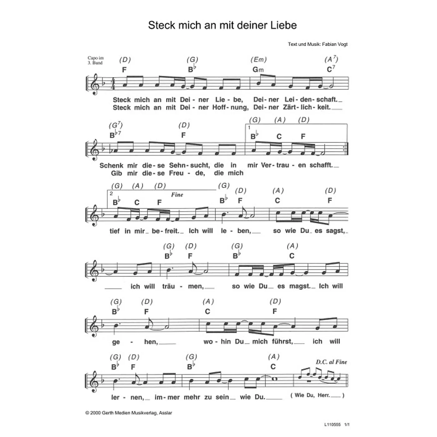 Steck mich an mit deiner Liebe (diese Variante haben Sie gerade ausgewählt) (Gemeindelied, modern, einstimmig, mit Akkorden, F-Dur) Fabian Vogt (Komposition, Text) |