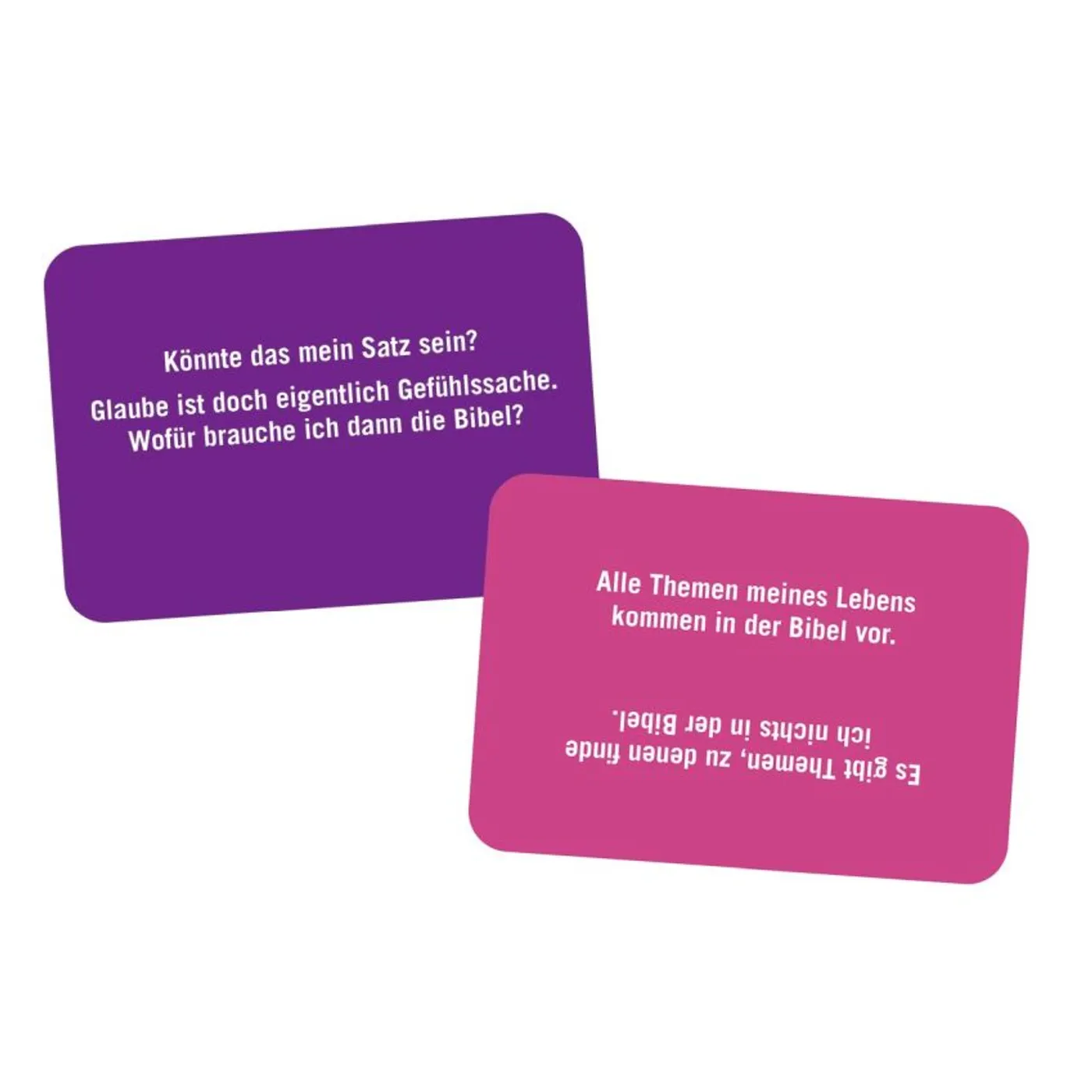 Diese Box enthält 120-farbige Impuls karten, die nach Themen sortiert sind. Die Karten sind von kräftigem pink bis zu einem feinen hellgrün ganz schön bunt. Die Themen so vielfältig. Es gibt Fragen: schaffen wir das? Schwer zu glauben? Tierisches! was wäre wenn…? Das ist nur eine kleine Auswahl der Rubrik, für die es dann Fragen gibt. Viele Karten haben auch auf der Rückseite einen QR-Code, indem dann die komplette Bibelstelle angezeigt bekommt. Finde ich richtig, richtig gut und funktioniert in einer Gruppe ganz toll. Der eine liest vor der andere erzählt, was dieser Bibelvers für ein bedeutet. Das sind so lebendige und ehrliche Gespräche.