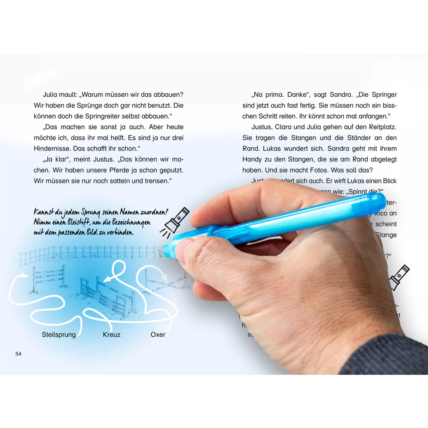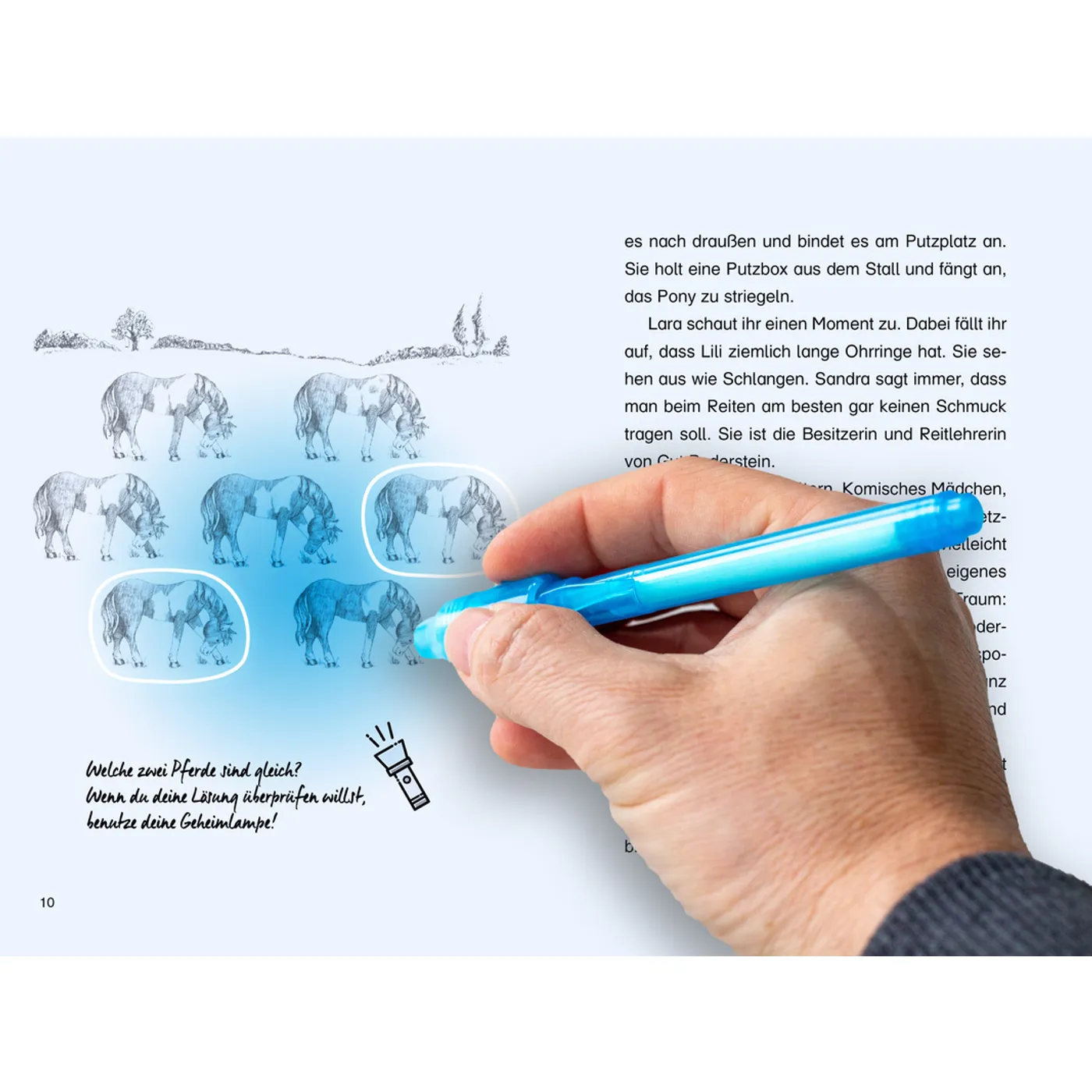 Vier wunderschöne Geschichten, rundum den Reiterhof laden zum Miträtseln und Knobeln ein. Mithilfe des Geheimstifts mit Entdeckerlampe kann man Unsichtbares ( selbst mit dem Geheimstift etwas schreiben oder Fragen in diesem Buch, deren Antworten unsichtbar sind ) sichtbar machen.