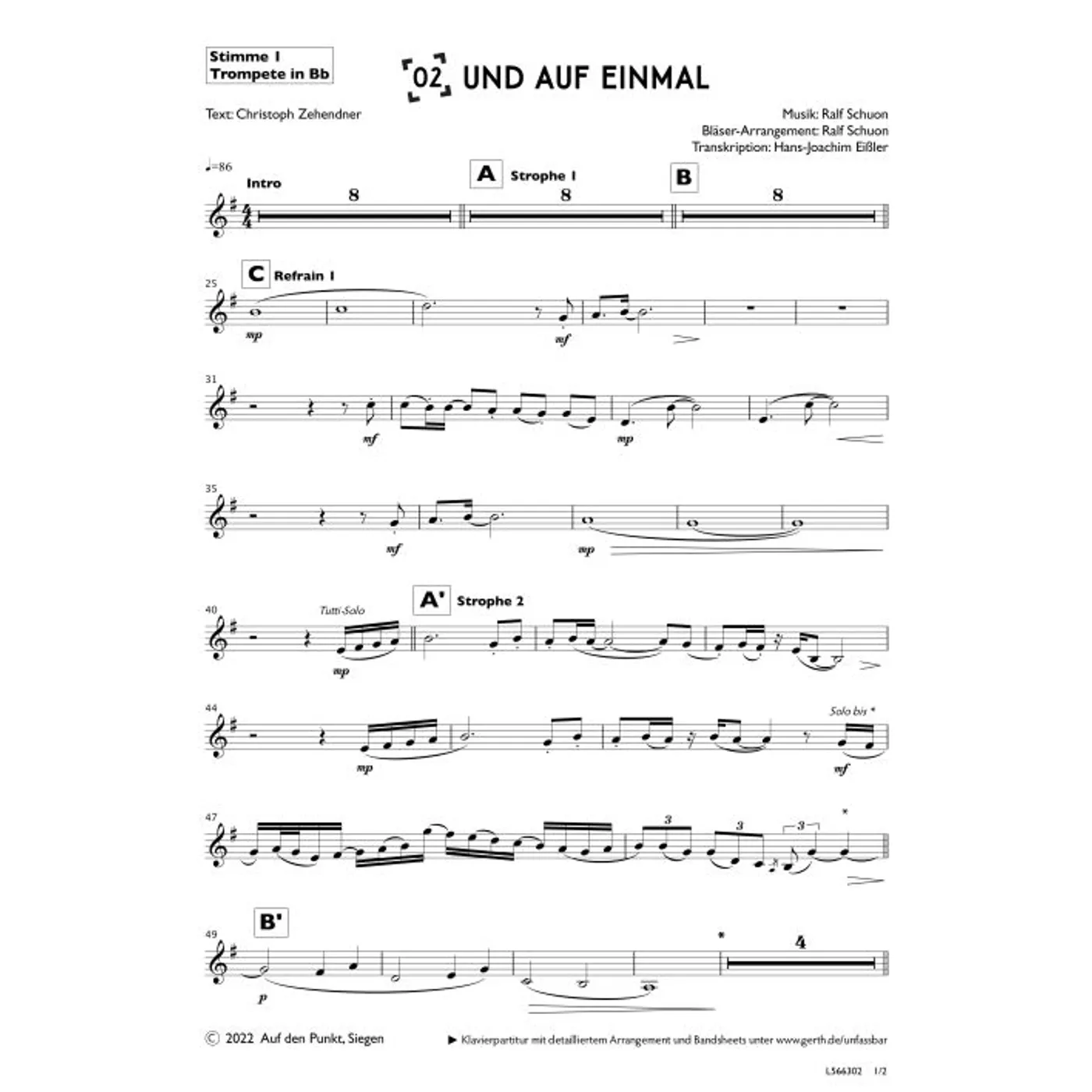 Und auf einmal (2. Trompete in Bb) (Gemeindelied, Bläser, Orchestereinzelstimme, F-Dur) Christoph Zehendner (Text), Hans-Joachim Eißler (Bläsersatz), Ralf Schuon (Bläsersatz, Komposition) | Gemeindelied, Bläser, Orchestereinzelstimme, F-Dur | 2,80 € | ||