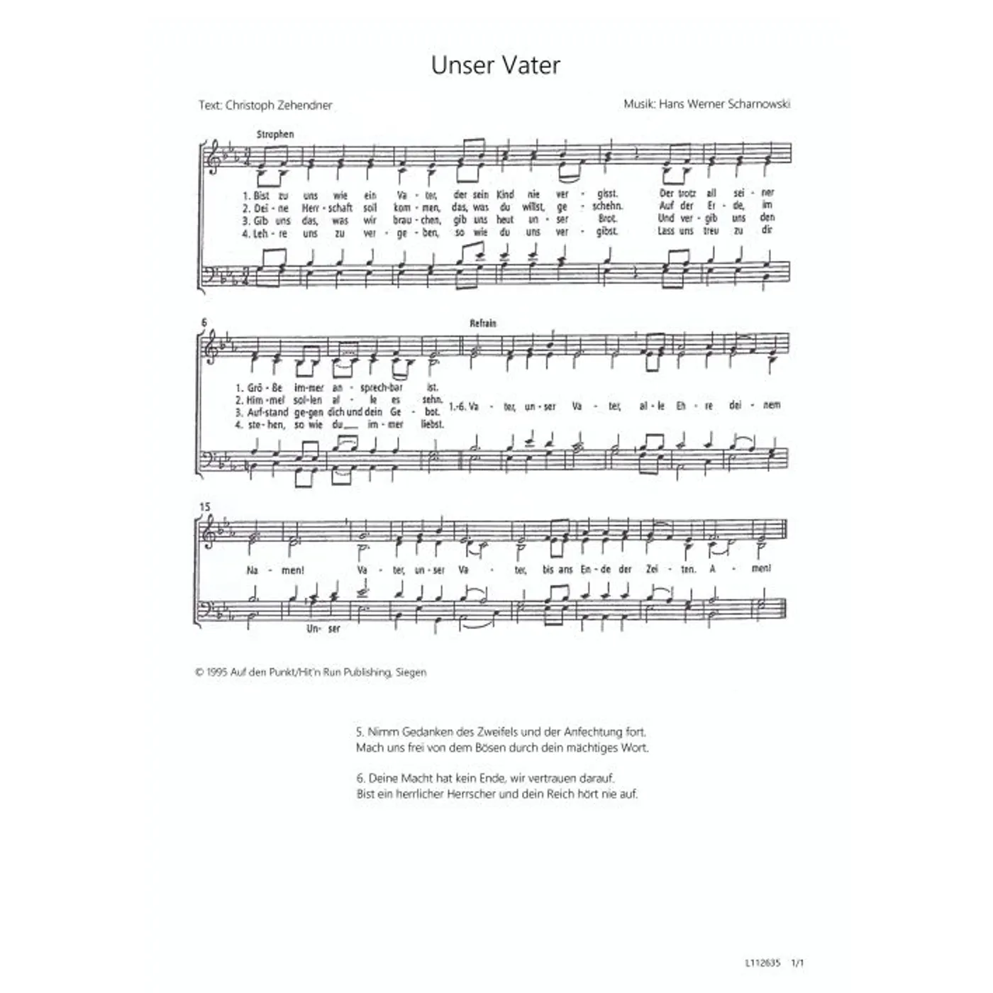 Unser Vater (diese Variante haben Sie gerade ausgewählt) (gemischter Chor, vierstimmig, Es-Dur) Hans Werner Scharnowski (Komposition), Christoph Zehendner (Text) |