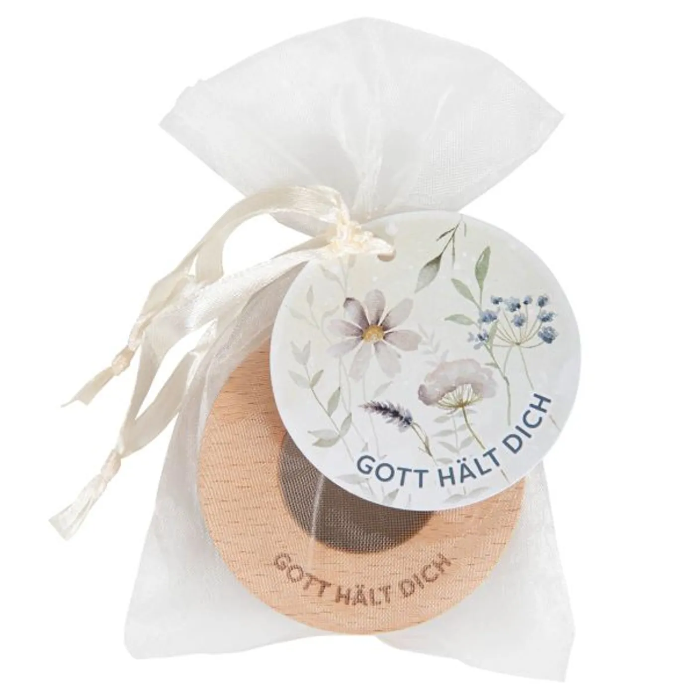 Veredelt mit Lasergravur: "Gott hält dich". Geschenkfertig im 2er-Set im Organzabeutel mit Anhänger verpackt.