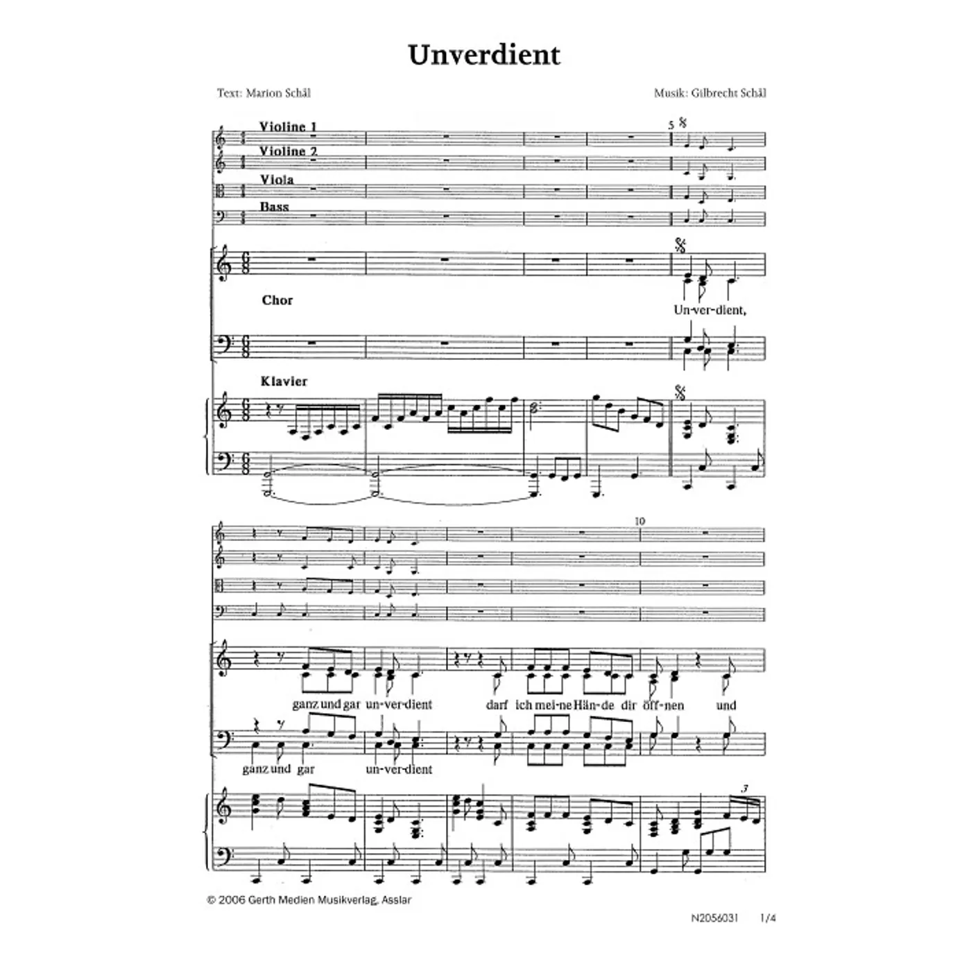 Unverdient (modern, Klavier, gemischter Chor, mit Akkorden, vierstimmig, C-Dur) Gilbrecht Schäl (Komposition, Bearbeiter), Marion Schäl (Text) | modern, Klavier, gemischter Chor, mit Akkorden, vierstimmig, C-Dur | 3,80 € | ||