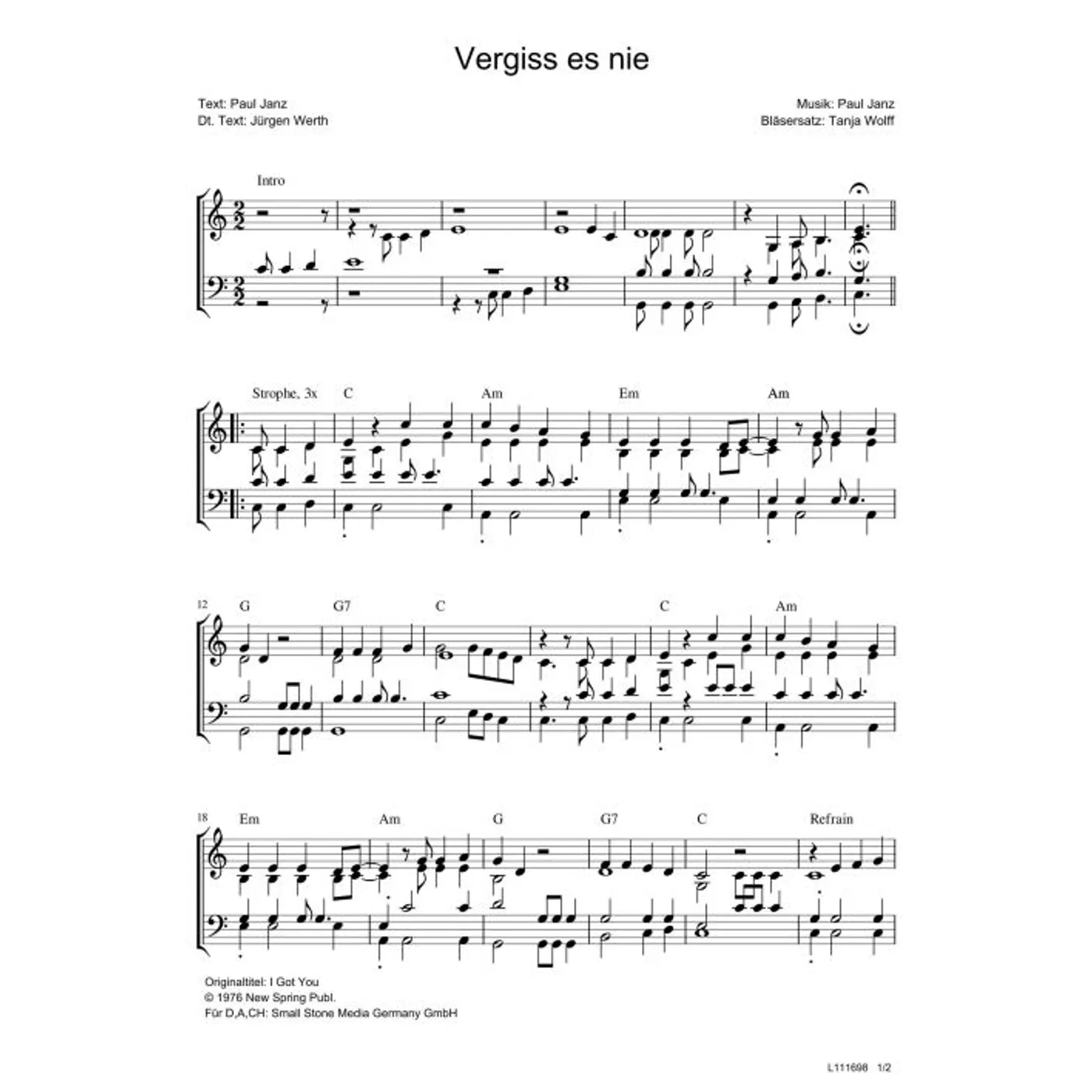 (Gemeindelied, modern, Bläser, Bläserpartitur, Partituren, vierstimmig) Paul Janz (Komposition, Text), Tanja Wolf (Bläsersatz), Jürgen Werth (Übersetzung)