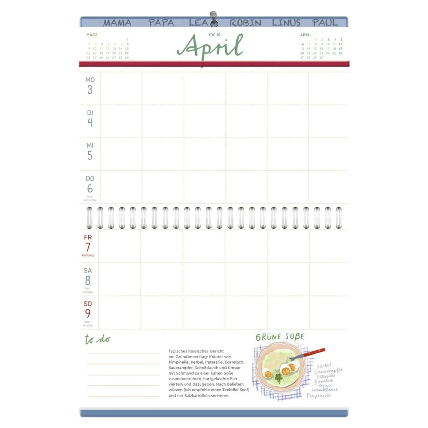 Der Kalender ist für bis zu sechs Familienmitglieder geeignet, die dank der praktischen Gestaltung nur einmal für alle Monate oben auf dem Einband eintragen werden. Das großzügige Kalendarium mit einer Woche pro Doppelseite bietet viel Platz für Termine und ToDos. Zu den hilfreichen Listen und Übersichten im Anhang gehören u.a. Stundenpläne, Urlaubspackliste, Haushaltsdienste, Gemüsekalender, Ferientermine und eine Jahresübersicht.