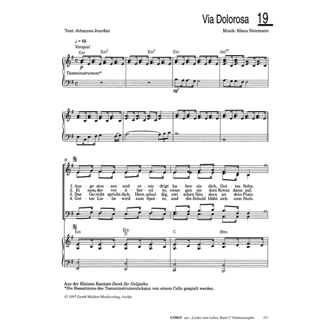 Via Dolorosa (traditionell, gemischter Chor, mit Akkorden, vierstimmig, E-Moll, gleiche Reihe) Klaus Heizmann (Komposition), Johannes Jourdan (Text) | traditionell, gemischter Chor, mit Akkorden, vierstimmig, E-Moll, gleiche Reihe | 1,50 € |