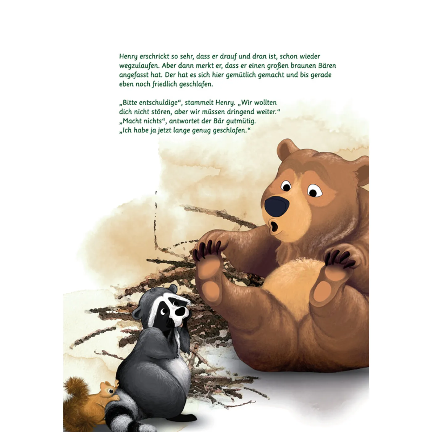 Die Geschichte handelt von Henry, dem Waschbären, der ein kleines Eichhörnchen namens Ben aufpäppelt und sich dann mit ihm auf die Suche nach dessen Eltern begibt. Doch die Eichhörnchensiedlung wurde gerodet. Nun bedarf es sehr viel Mut und auch Vertrauen auf Gott und dessen Hilfe. Darauf beruht diese Geschichte und ist sehr schön und liebevoll erzählt. Es steckt sehr viel Wärme und Liebe darin und man merkt das Herzblut mit dem die Autorin diese Geschichte geschrieben hat.