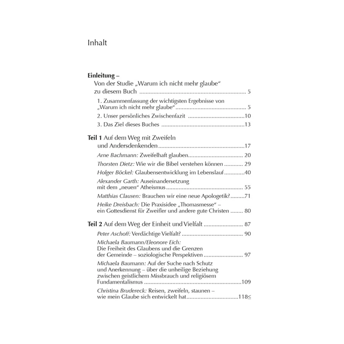 Das Buch behandelt aus meiner Sicht sehr aktuelle Problematiken in einer äußerst angenehmen Art und Weise. Angenehm vor allem die Herangehensweise: Ein Buch, in dem auch Zweifel ihren Platz haben. Die verschiedenen Autoren aus den unterschiedlichsten Kontexten suchen gemeinsam mit ihren Lesern Antworten auf drängende Fragen, vor denen Christen die Augen nicht verschließen sollten und die hier ziemlich gut herausgearbeitet werden. Es geht um den Umgang mit Zweifeln, welche wir wohl alle hin und wieder haben, aber auch mit Andersdenkenden. Es geht um Einheit und Vielfalt, religiösen Fundamentalismus und geistlichen Missbrauch, ganz besonders Herausforderungen, denen Gemeinden sich in diesem Sinne stellen müssen. Eine Gemeindeleitung, die ihrem Auftrag nicht nachkommt, führt schließlich zu Unglaubwürdigkeit. Im vierten und letzten Abschnitt steht der persönliche Glaube und seine Entwicklung hin zu einem mündigen Glauben im Fokus; einem Glauben, der auch mit Kritik und hartnäckigen Gedanken umzugehen gelernt hat.