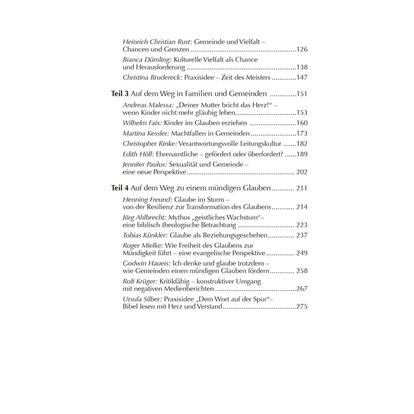 Die Autoren, manche bekannter als andere, kommen aus ganz unterschiedlichen Richtungen und widmen sich verschiedenen Schwerpunkten. In Teil 1 geht es um Zweifel, in Teil 2 um die Vielfalt des Glaubens, in Teil 3 um Glaube in Familie und Gemeinde und in Teil 4 um Wege, mündigen Glauben zu stärken und zu fördern. Die Facetten, die sie beleuchten, bilden dabei ein breites Spektrum ab: ein mündiges Verständnis der Bibel, der „neue“ Atheismus, geistlicher Missbrauch, religiöser Fundamentalismus, kulturelle Vielfalt, Machtfallen in der Gemeinde, Glaubenserziehung für Kinder, Ehrenamtliche in der Gemeinde, verantwortungsvolles Leiten, Sexualität und Gemeinde, geistliches Wachstum, Umgang mit negativen Medienberichten, uvm. Abgerundet wird dieses theorielastige Buch noch durch ein paar erprobte (!) Praxisideen.