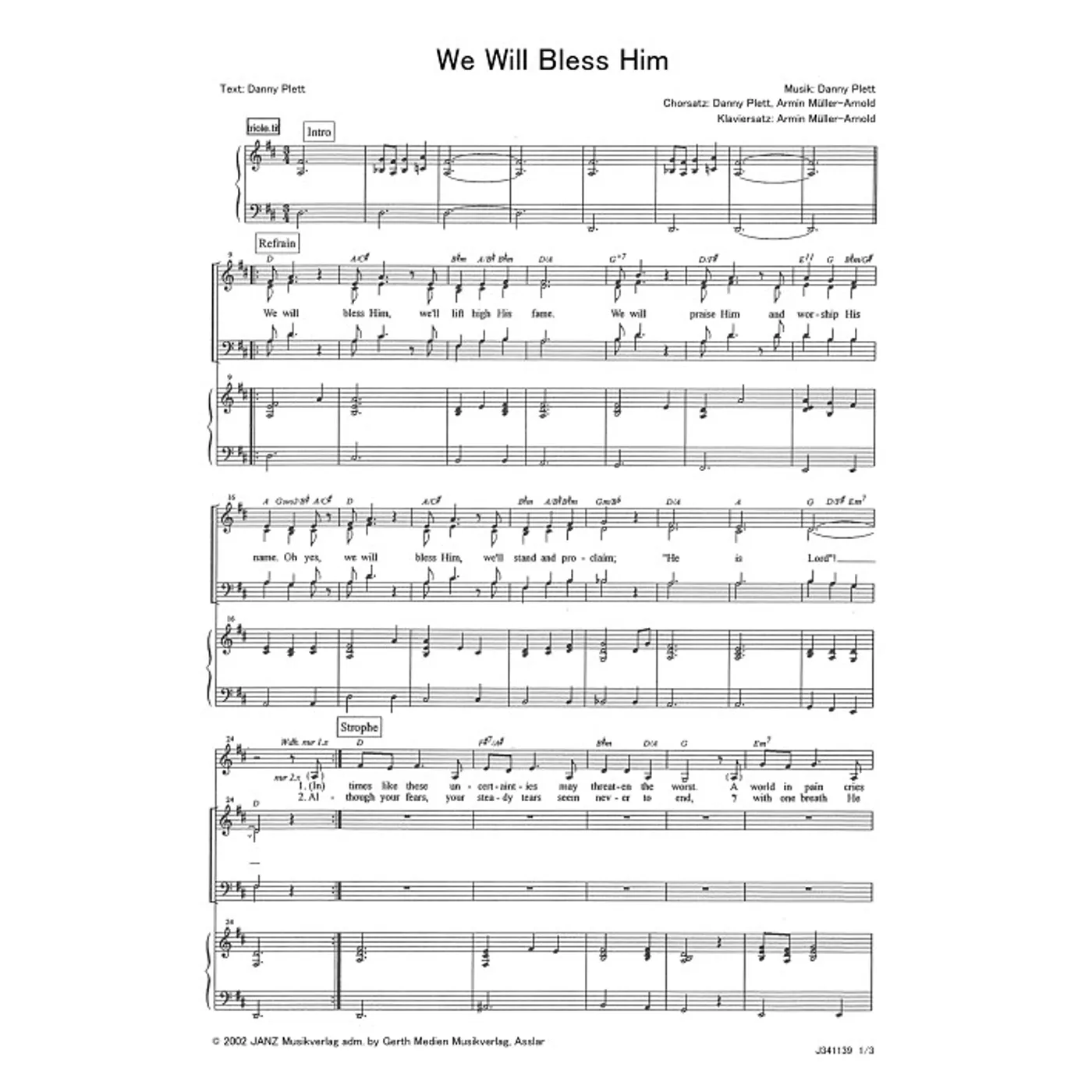 We Will Bless Him (diese Variante haben Sie gerade ausgewählt) (modern, Klavier, gemischter Chor, mit Akkorden, vierstimmig, D-Dur) Danny Plett (Komposition, Text, Chorsatz), Armin Müller-Arnold (Klaviersatz) |