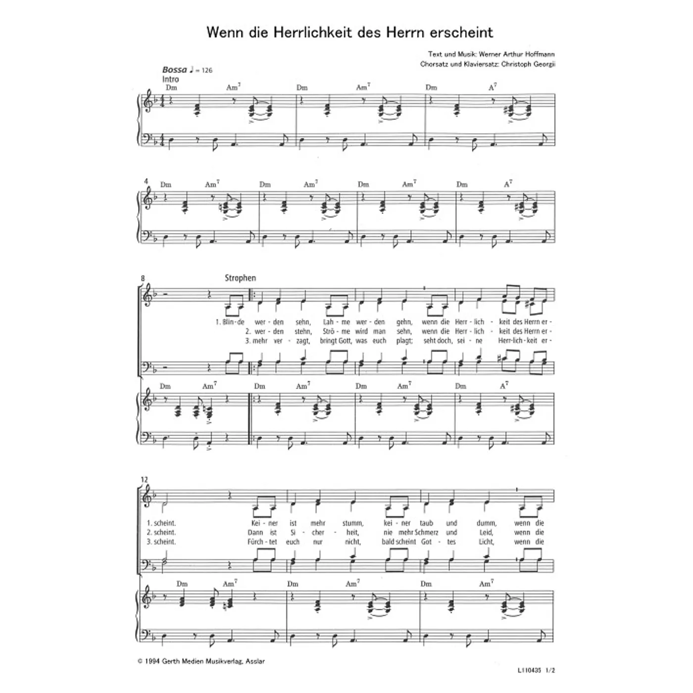 Wenn die Herrlichkeit des Herrn erscheint (diese Variante haben Sie gerade ausgewählt) (traditionell, Klavier, gemischter Chor, mit Akkorden, vierstimmig, D-Moll) Werner A. Hoffmann (Komposition, Text), Christoph Georgii (Klaviersatz) |