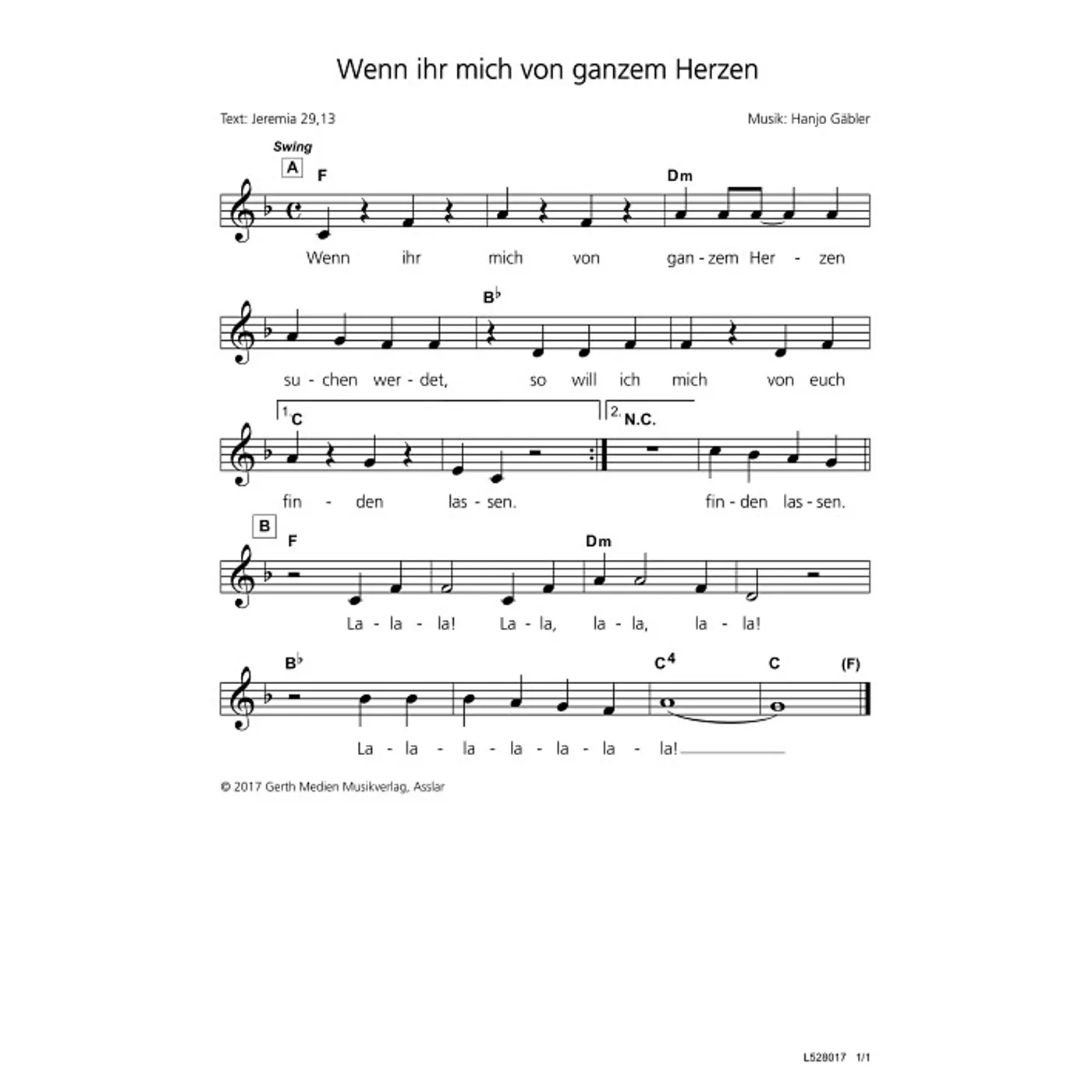 Wenn Ihr mich von ganzem Herzen (diese Variante haben Sie gerade ausgewählt) (einstimmig, mit Akkorden, F-Dur) Hanjo Gäbler (Komposition) |