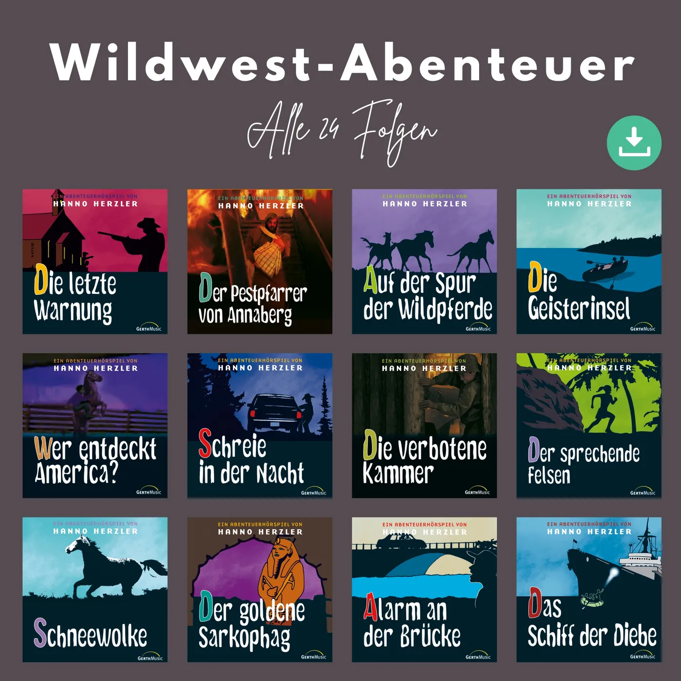 Die spannenden Hörspiele von Hanno Herzler entführen abenteuerlustige Kids in die aufregende Welt des Wilden Westens. Gemeinsam mit den Hörspielhelden Billy, Willy, Moppel und Babs erleben sie hier spannende Abenteuer. Für Hörspiel-Freunde, die gern christliche Botschaften zusammen mit einer spannenden Handlung erleben, ist die Serie genau richtig. Das Paket enthält alle 24 Wildwest-Abenteuer-Folgen von Hanno Herzler. Im mp3-Format – zum Download.