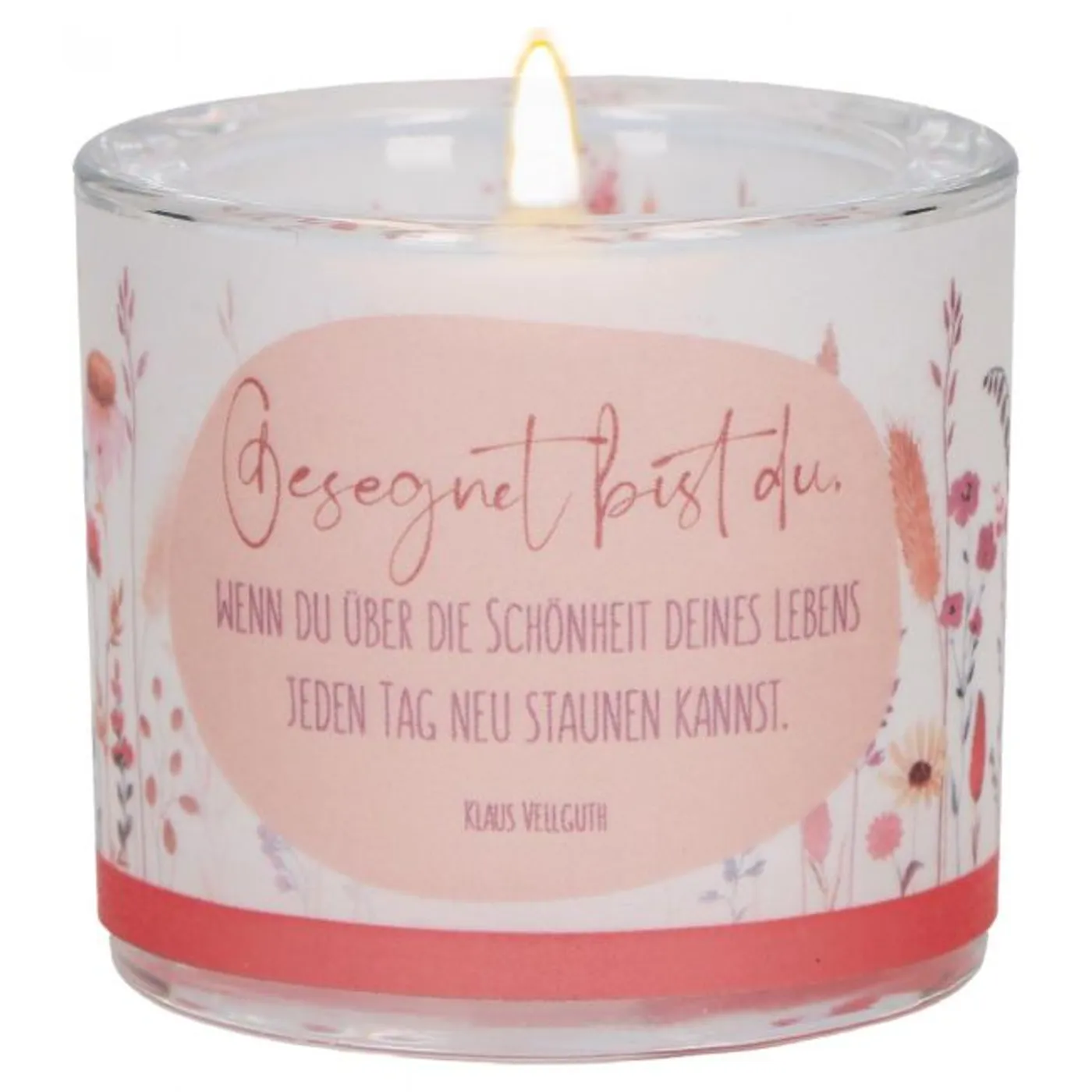 Das schöne LichtMoment "Lebenssegen" begeistert mit einem liebevoll arrangierten floralen Design. Das hochwertige Windlicht ist aus mundgeblasenem Glas gefertigt. Auf dem im Vierfarbdruck gestalteten Pergamentumleger sind Wiesenblumen zu erkennen. Den Text von Klaus Vellguth "Gesegnet bist du, wenn du über die Schönheit deines Lebens jeden Tag neu staunen kannst." ist auf der Banderole auch zu lesen.